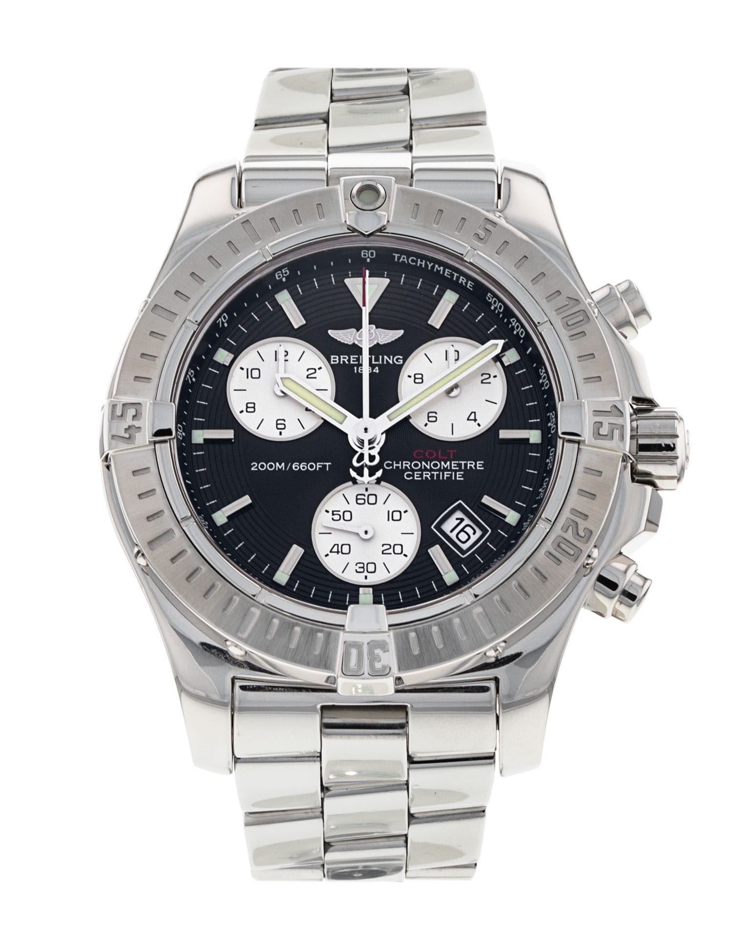 The Colt was originally made by Breitling in the 1980s, and was intended for use by the armed forces (as were its older siblings, the Navitimer and the Chronomat, incidentally). While perhaps not as famous as these other legendary timepieces, Colt watches have become some of Breitling's most popular and accessible models thanks to their great legibility and sturdiness. The case is beautifully finished—as is the textured dial—and boasts a rotating bezel on top of the 200m water resistance. The watch keeps exceptionally accurate time thanks to its superbly designed superquartz movement. It features a useful and intuitive chronograph display.