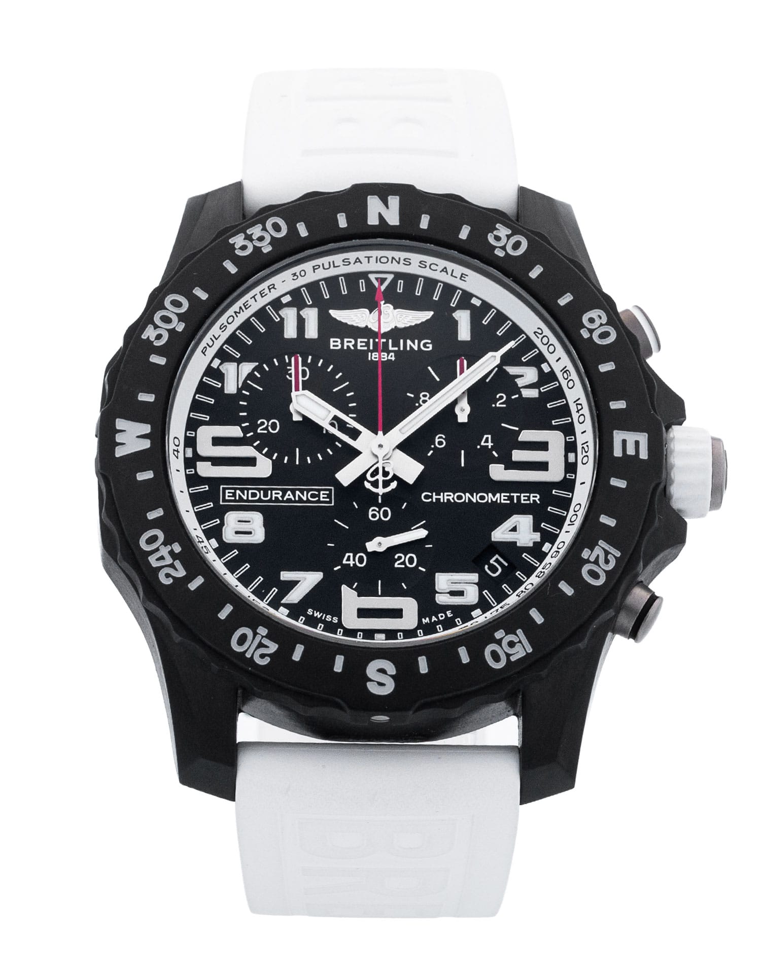 This Breitling Endurance Pro X82310 has a black arabic dial and a rubber strap. This Breitling has undergone a thorough inspection of water resistance, accuracy, functionality and condition to determine the level of reconditioning required to meet our strict standards. It has also been referenced against technical documents and manufacturer records where available to ensure authenticity and a clean history. All our watches have a 24-month warranty for your peace of mind.