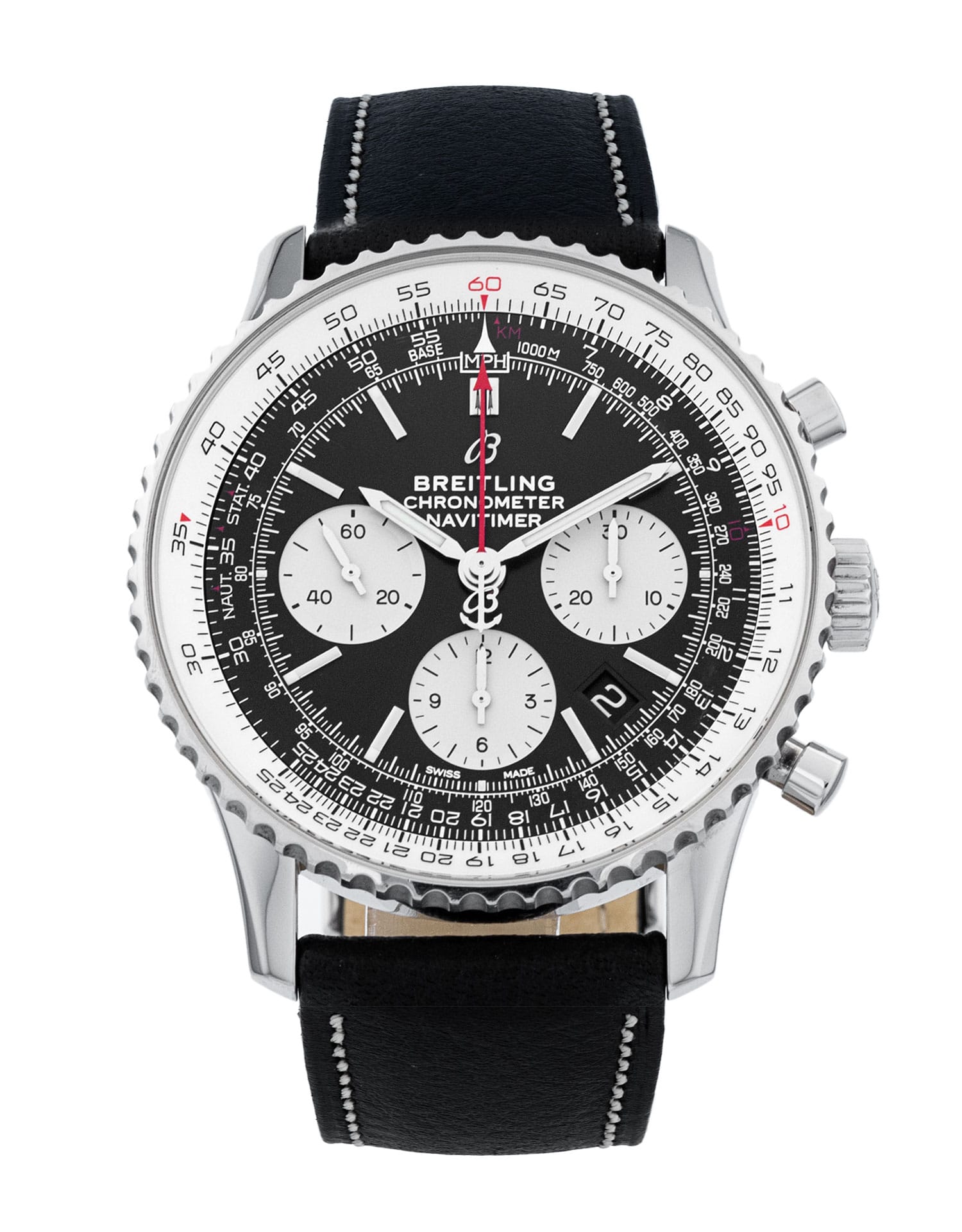 This Breitling Navitimer 01 AB0121 has a black baton - silver sub-dials dial and a leather strap. This Breitling has undergone a thorough inspection of water resistance, accuracy, functionality and condition to determine the level of reconditioning required to meet our strict standards. It has also been referenced against technical documents and manufacturer records where available to ensure authenticity and a clean history. Our watches have a 24-month warranty for your peace of mind, in conjunction with any remaining manufacturer’s warranty from new or from service.