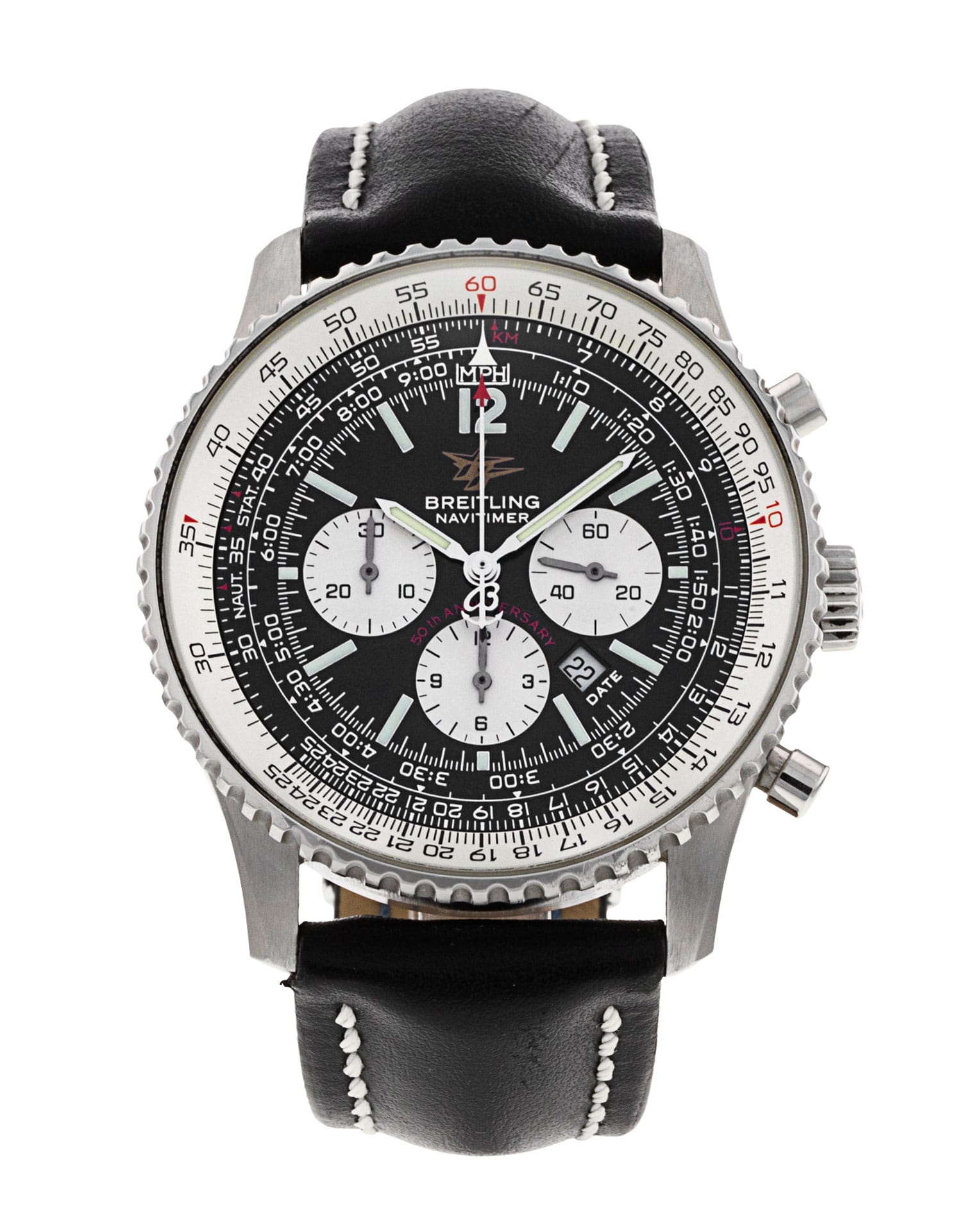This Breitling Navitimer A41322 has a black baton dial and a leather strap. This Breitling has undergone a thorough inspection of water resistance, accuracy, functionality and condition to determine the level of reconditioning required to meet our strict standards. It has also been referenced against technical documents and manufacturer records where available to ensure authenticity and a clean history. All our watches have a 24-month warranty for your peace of mind.