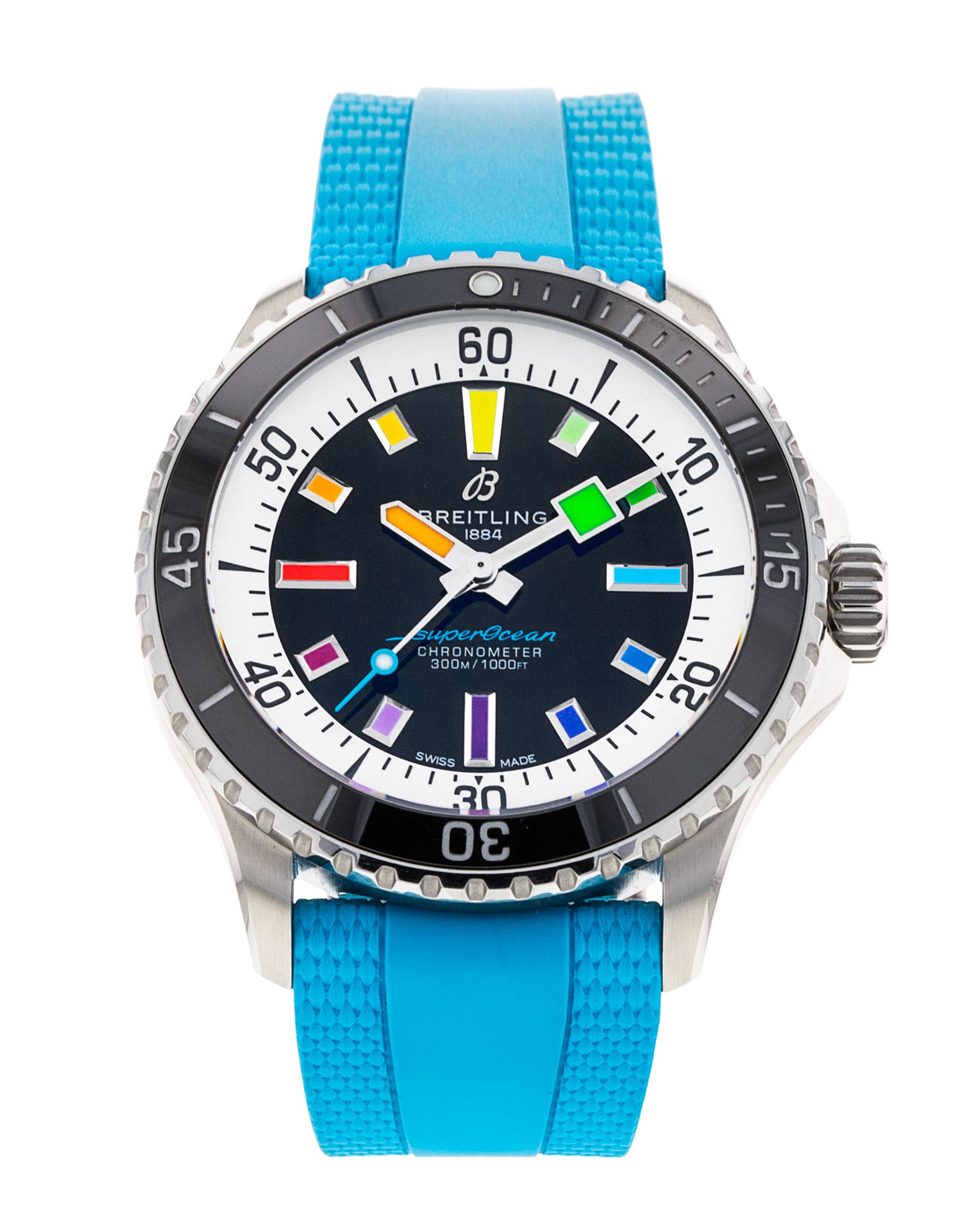 This Breitling SuperOcean Automatic 42 A17375 has a black dial and a rubber strap. This Breitling has undergone a thorough inspection of water resistance, accuracy, functionality and condition to determine the level of reconditioning required to meet our strict standards. It has also been referenced against technical documents and manufacturer records where available to ensure authenticity and a clean history. Our watches have a 24-month warranty for your peace of mind, in conjunction with any remaining manufacturer’s warranty from new or from service.