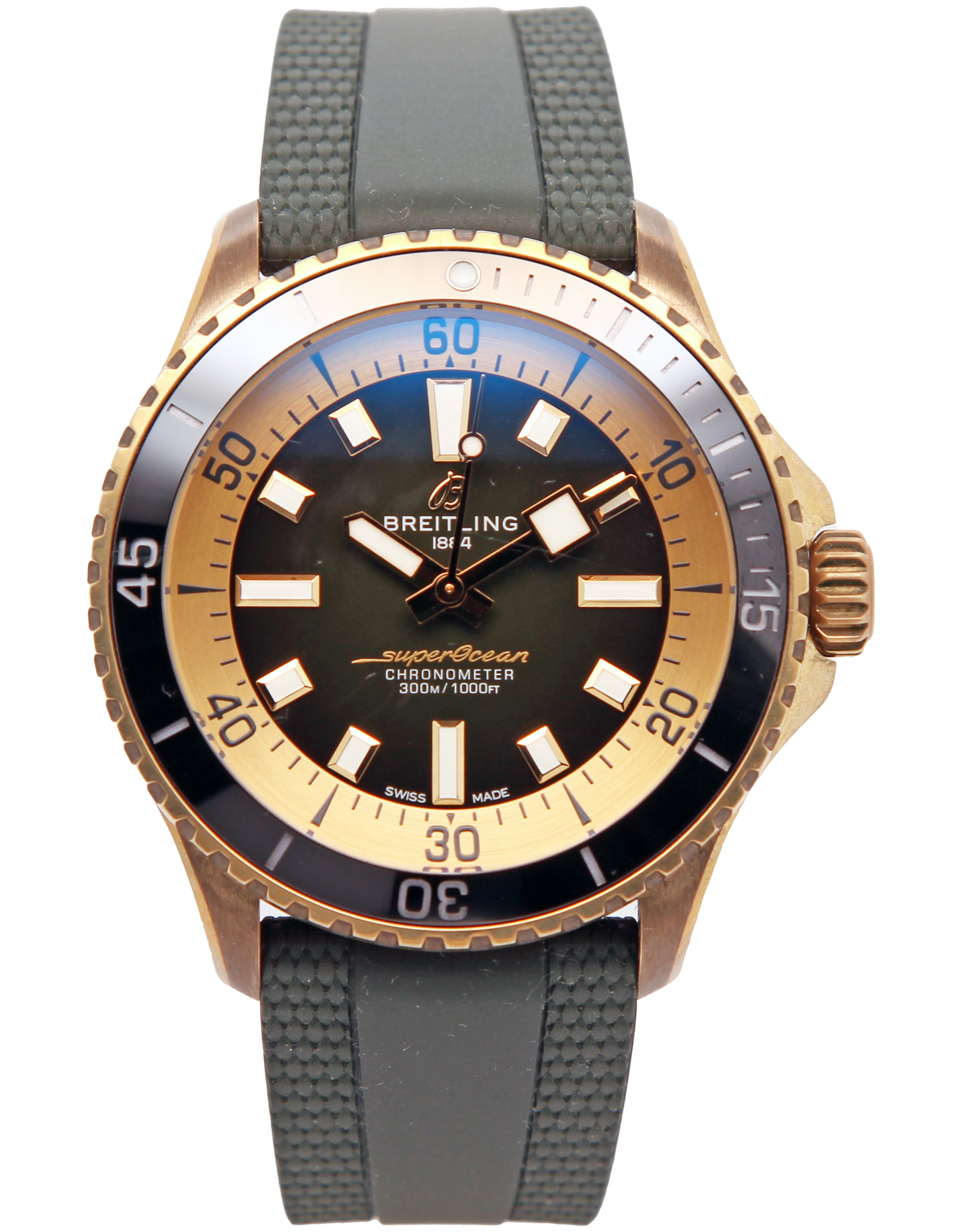 This Breitling SuperOcean Automatic 42 N17375 has a green dial and a rubber strap. This Breitling has undergone a thorough inspection of water resistance, accuracy, functionality and condition to determine the level of reconditioning required to meet our strict standards. It has also been referenced against technical documents and manufacturer records where available to ensure authenticity and a clean history. Our watches have a 24-month warranty for your peace of mind, in conjunction with any remaining manufacturer’s warranty from new or from service.