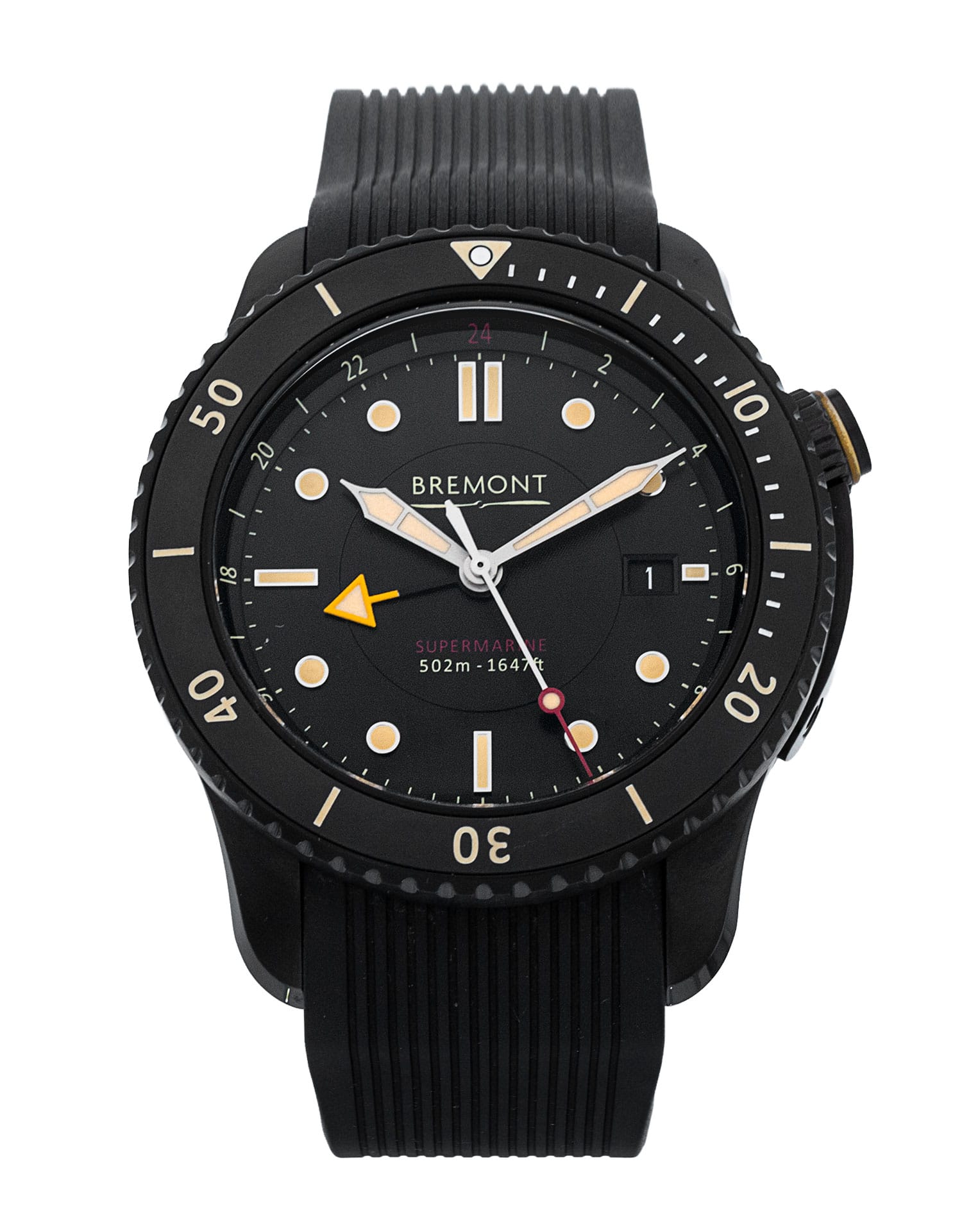 This Bremont Supermarine S502 JET has a black dial and a rubber strap. This Bremont has undergone a thorough inspection of water resistance, accuracy, functionality and condition to determine the level of reconditioning required to meet our strict standards. It has also been referenced against technical documents and manufacturer records where available to ensure authenticity and a clean history. All our watches have a 24-month warranty for your peace of mind.
