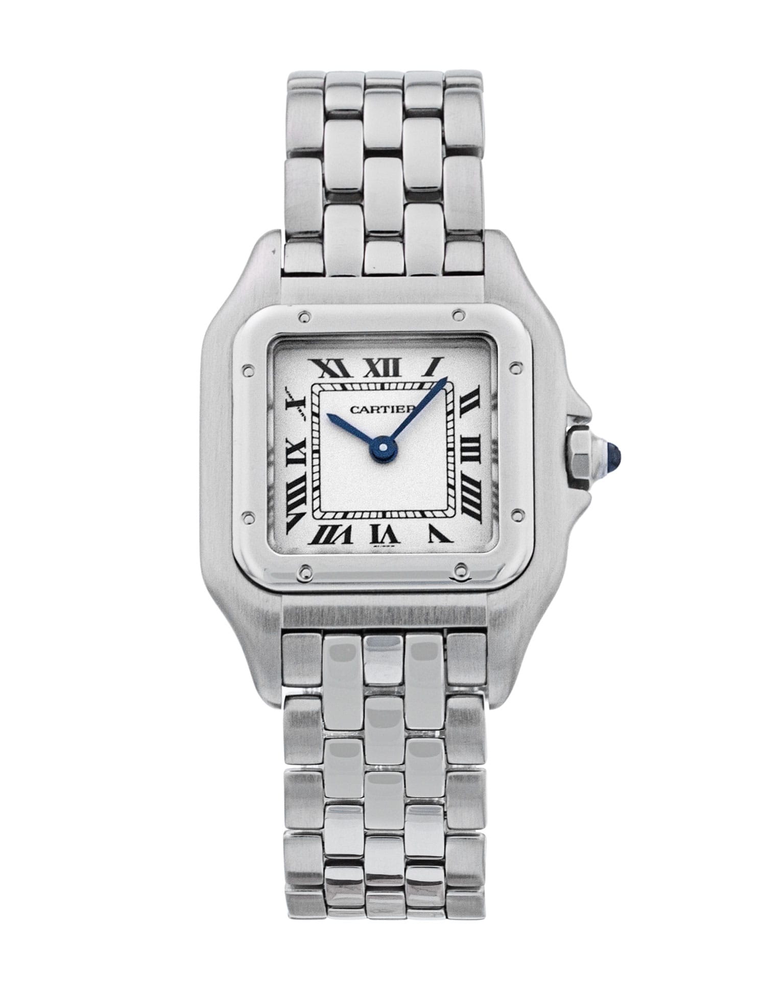 This Cartier Panthere W25033P5 has a silver roman numeral dial and a bracelet strap. This Cartier has undergone a thorough inspection of accuracy, functionality and condition at our Cartier certified service centre to determine the level of reconditioning required to meet our strict standards. It has also been checked against our records to ensure authenticity. All our watches have a 24-month warranty for your peace of mind.