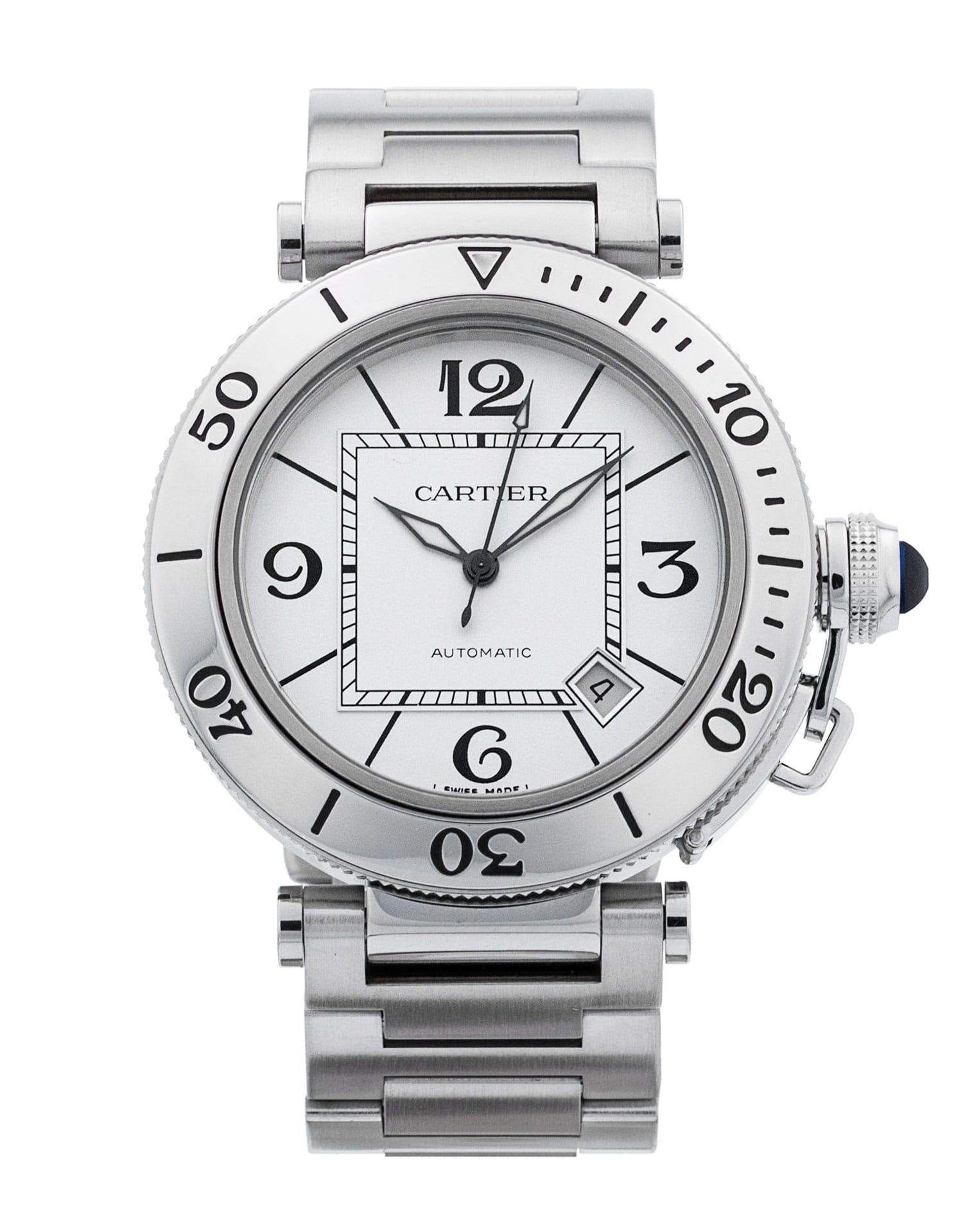 This Cartier Pasha W31080M7 has a silver quarter arabic dial and a bracelet strap. This Cartier has undergone a thorough inspection of accuracy, functionality and condition at our Cartier certified service centre to determine the level of reconditioning required to meet our strict standards. It has also been checked against our records to ensure authenticity. All our watches have a 24-month warranty for your peace of mind.