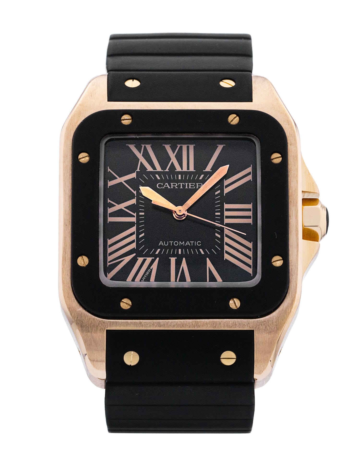 This Cartier Santos 100 W20124U2 has a black roman numeral dial and a rubber strap. This Cartier has undergone a thorough inspection of accuracy, functionality and condition at our Cartier certified service centre to determine the level of reconditioning required to meet our strict standards. It has also been checked against our records to ensure authenticity. All our watches have a 24-month warranty for your peace of mind.