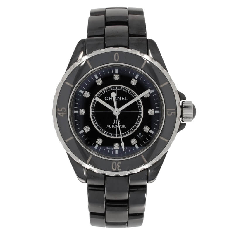 This Chanel J12 H1626 has a black diamond dial and a bracelet strap. This Chanel has undergone a thorough inspection of water resistance, accuracy, functionality and condition to determine the level of reconditioning required to meet our strict standards. It has also been referenced against technical documents and manufacturer records where available to ensure authenticity and a clean history. All our watches have a 24-month warranty for your peace of mind.