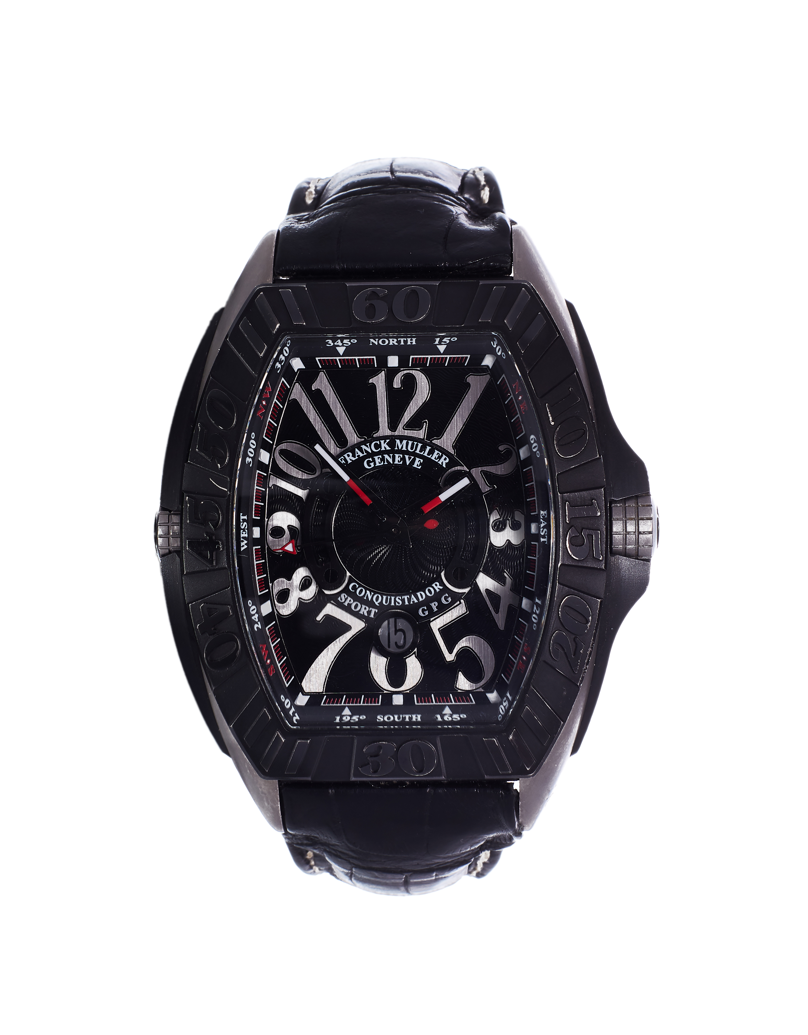 This Franck Muller Conquistador 9900 SC DT GPG has a black arabic dial and a leather strap. This Franck Muller has undergone a thorough inspection of water resistance, accuracy, functionality and condition to determine the level of reconditioning required to meet our strict standards. It has also been referenced against technical documents and manufacturer records where available to ensure authenticity and a clean history. All our watches have a 24-month warranty for your peace of mind.