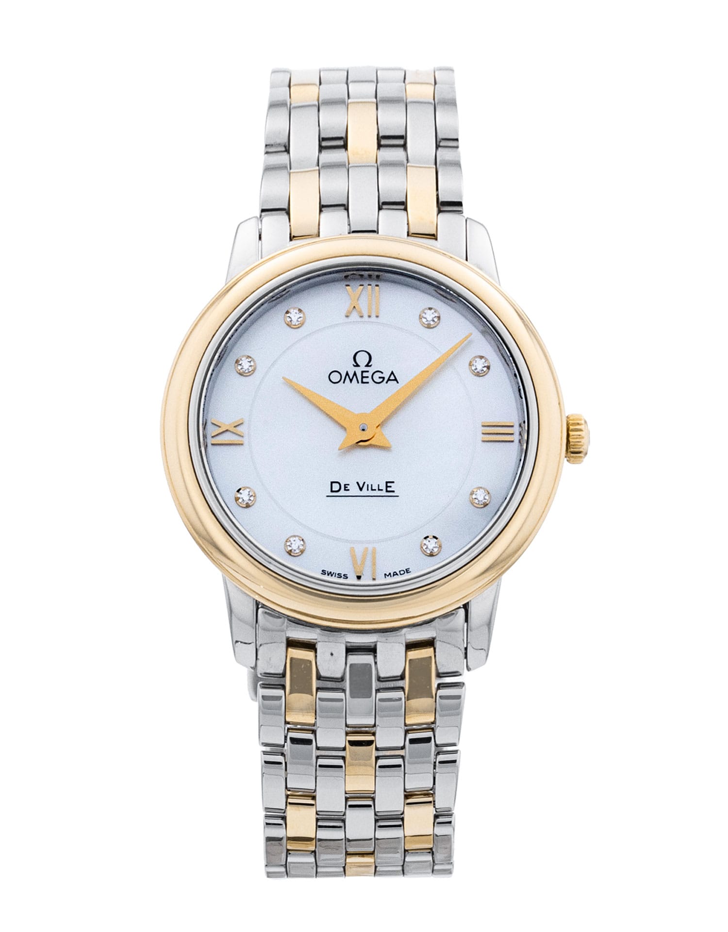 This Omega De Ville Prestige Ladies 424.20.27.60.55.001 has a mother of pearl white - diamond dial and a bracelet strap. This Omega has undergone a thorough inspection of accuracy, functionality and condition at our Omega certified service centre to determine the level of reconditioning required to meet our strict standards. It has also been checked against our records to ensure authenticity. All our watches have a 24-month warranty for your peace of mind.