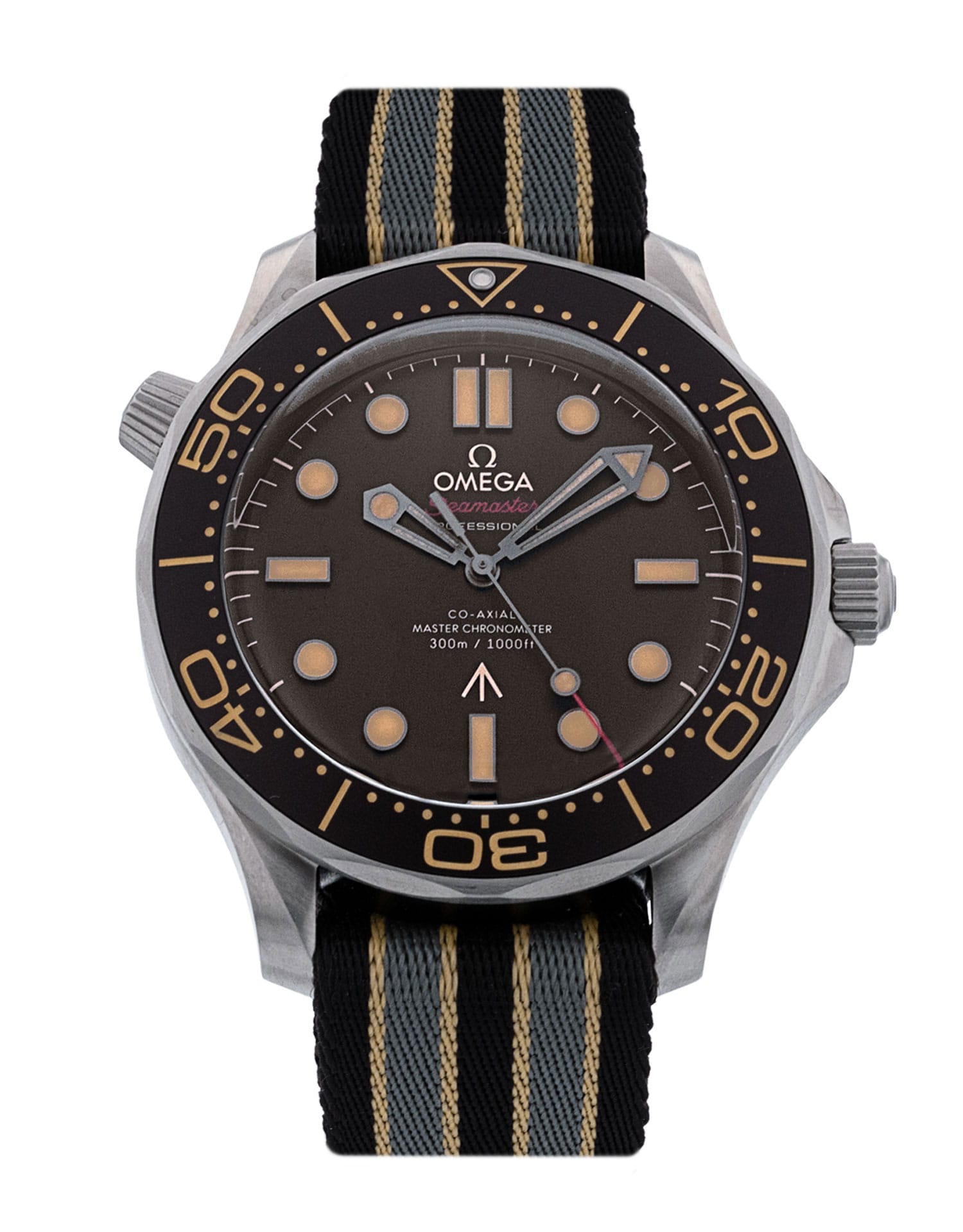 This Omega Seamaster Diver 300m - James Bond Edition 210.92.42.20.01.001 has a brown dial and a fabric strap. This Omega has undergone a thorough inspection of accuracy, functionality and condition at our Omega certified service centre to determine the level of reconditioning required to meet our strict standards. It has also been checked against our records to ensure authenticity. Our watches have a 24-month warranty for your peace of mind, in conjunction with any remaining manufacturer’s warranty from new or from service.