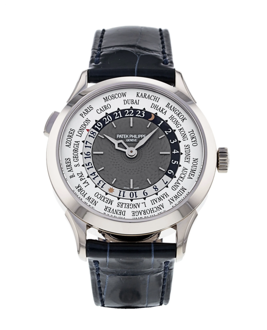 This Patek Philippe World Time 5230G-014 has a grey dial and a leather strap. This Patek Philippe has undergone a thorough inspection of water resistance, accuracy, functionality and condition to determine the level of reconditioning required to meet our strict standards. It has also been referenced against technical documents and manufacturer records where available to ensure authenticity and a clean history. All our watches have a 24-month warranty for your peace of mind.