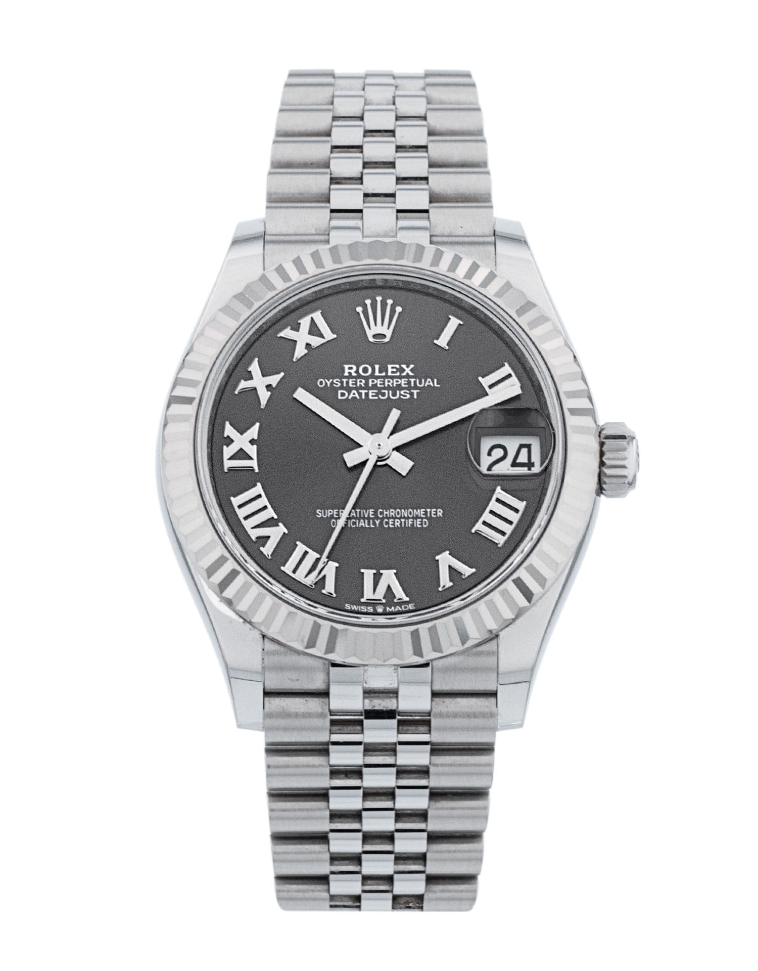 This Rolex Datejust Lady 31 278274 has a grey roman numeral dial and a bracelet strap. This Rolex has undergone a thorough inspection of water resistance, accuracy, functionality and condition to determine the level of reconditioning required to meet our strict standards. It has also been referenced against technical documents and manufacturer records where available to ensure authenticity and a clean history. Our watches have a 24-month warranty for your peace of mind, in conjunction with any remaining manufacturer’s warranty from new or from service. To maintain the manufacturer’s warranty on this watch, it has not been polished in our service centre.