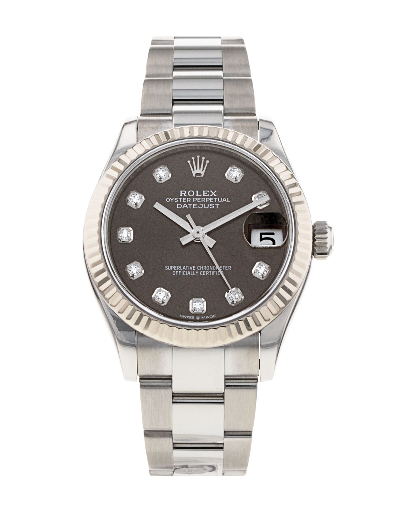 This Rolex Datejust Lady 31 278274 has a dark grey diamond dial and a bracelet strap. This Rolex has undergone a thorough inspection of water resistance, accuracy, functionality and condition to determine the level of reconditioning required to meet our strict standards. It has also been referenced against technical documents and manufacturer records where available to ensure authenticity and a clean history. All our watches have a 24-month warranty for your peace of mind. One of our skilled polishing technicians has removed marks on the case and bracelet of this watch, brought about by daily wear and tear, which is why this watch does not come with the remaining manufacturer’s warranty.