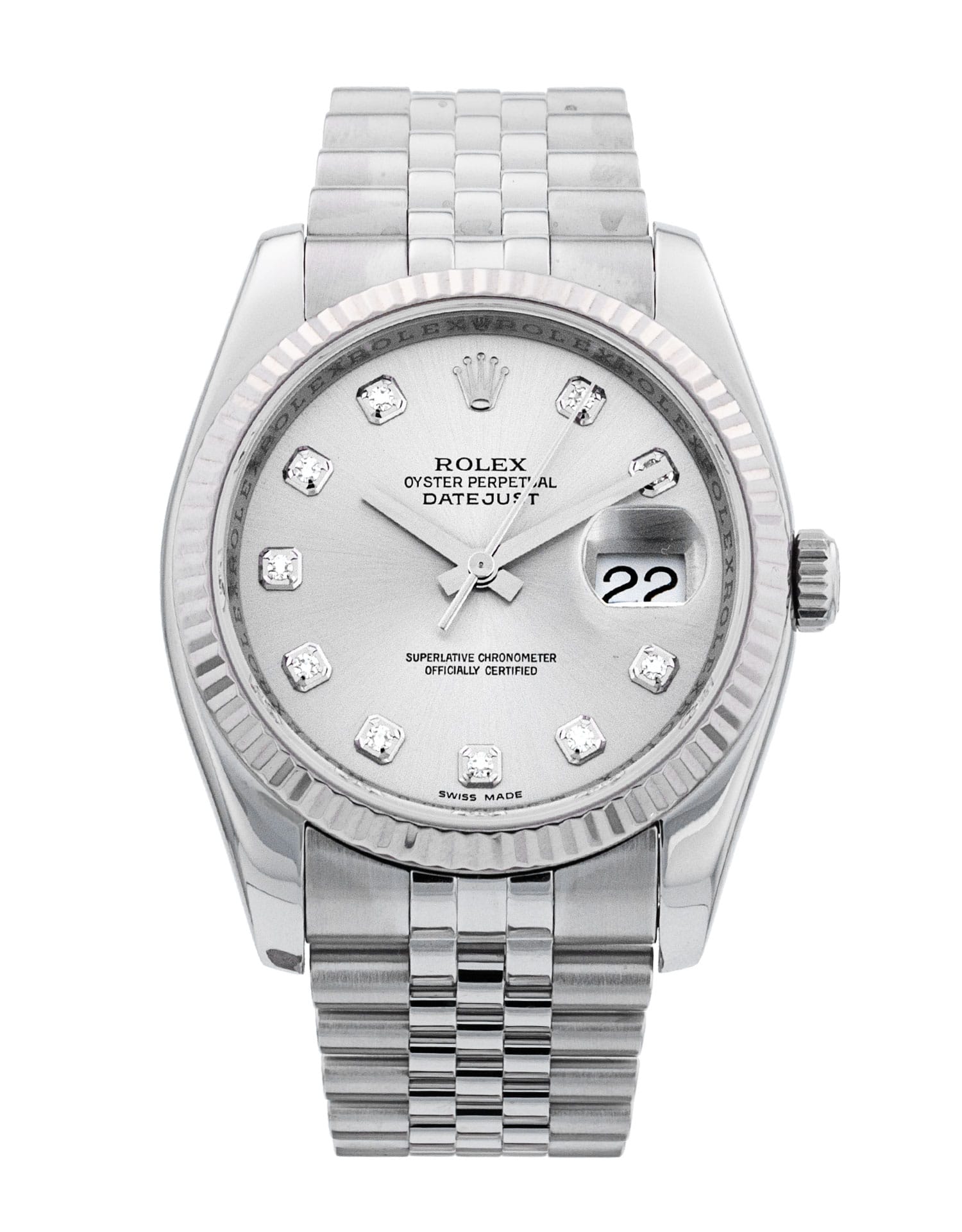 This Rolex Datejust 116234 has a silver diamond dial and a bracelet strap. This Rolex has undergone a thorough inspection of water resistance, accuracy, functionality and condition to determine the level of reconditioning required to meet our strict standards. It has also been referenced against technical documents and manufacturer records where available to ensure authenticity and a clean history. All our watches have a 24-month warranty for your peace of mind. One of our skilled polishing technicians has removed marks on the case and bracelet of this watch, brought about by daily wear and tear, which is why this watch does not come with the remaining manufacturer’s warranty.