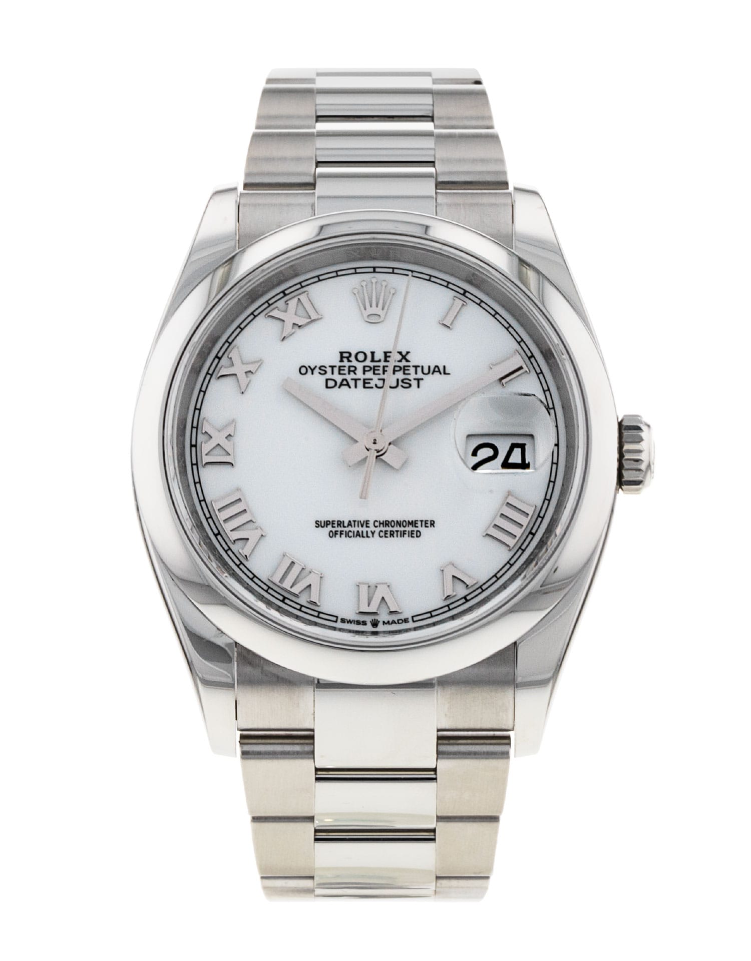 This Rolex Datejust 126200 has a white roman numeral dial and a bracelet strap. This Rolex has undergone a thorough inspection of water resistance, accuracy, functionality and condition to determine the level of reconditioning required to meet our strict standards. It has also been referenced against technical documents and manufacturer records where available to ensure authenticity and a clean history. All our watches have a 24-month warranty for your peace of mind. One of our skilled polishing technicians has removed marks on the case and bracelet of this watch, brought about by daily wear and tear, which is why this watch does not come with the remaining manufacturer’s warranty.