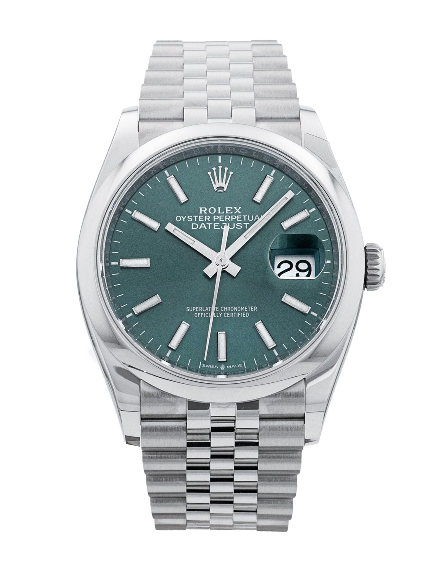 This Rolex Datejust 126200 has a mint green baton dial and a bracelet strap. This Rolex has undergone a thorough inspection of water resistance, accuracy, functionality and condition to determine the level of reconditioning required to meet our strict standards. It has also been referenced against technical documents and manufacturer records where available to ensure authenticity and a clean history. Our watches have a 24-month warranty for your peace of mind, in conjunction with any remaining manufacturer’s warranty from new or from service. To maintain the manufacturer’s warranty on this watch, it has not been polished in our service centre.