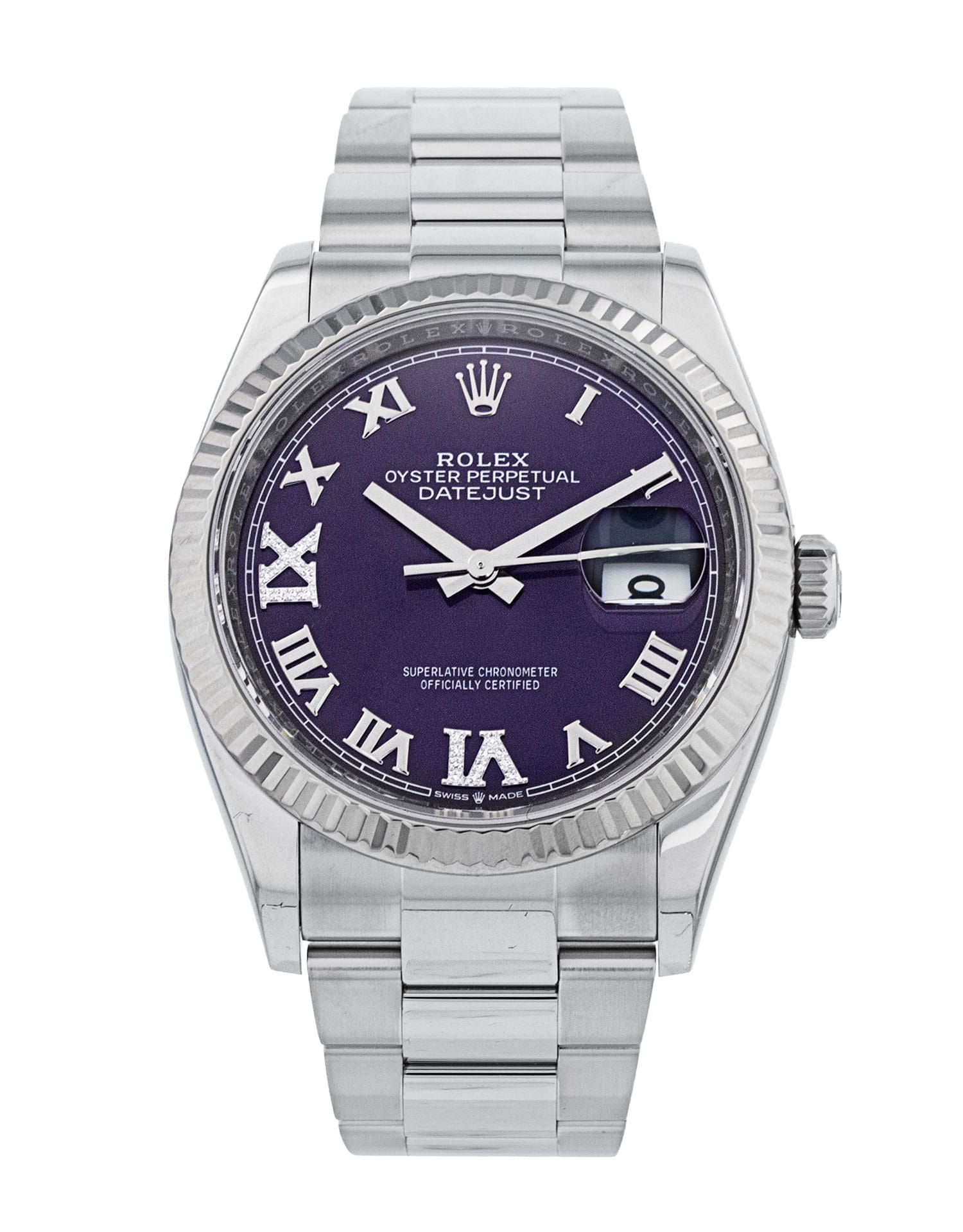 This Rolex Datejust 126234 has a aubergine diamond dial and a bracelet strap. This Rolex has undergone a thorough inspection of water resistance, accuracy, functionality and condition to determine the level of reconditioning required to meet our strict standards. It has also been referenced against technical documents and manufacturer records where available to ensure authenticity and a clean history. Our watches have a 24-month warranty for your peace of mind, in conjunction with any remaining manufacturer’s warranty from new or from service. To maintain the manufacturer’s warranty on this watch, it has not been polished in our service centre.