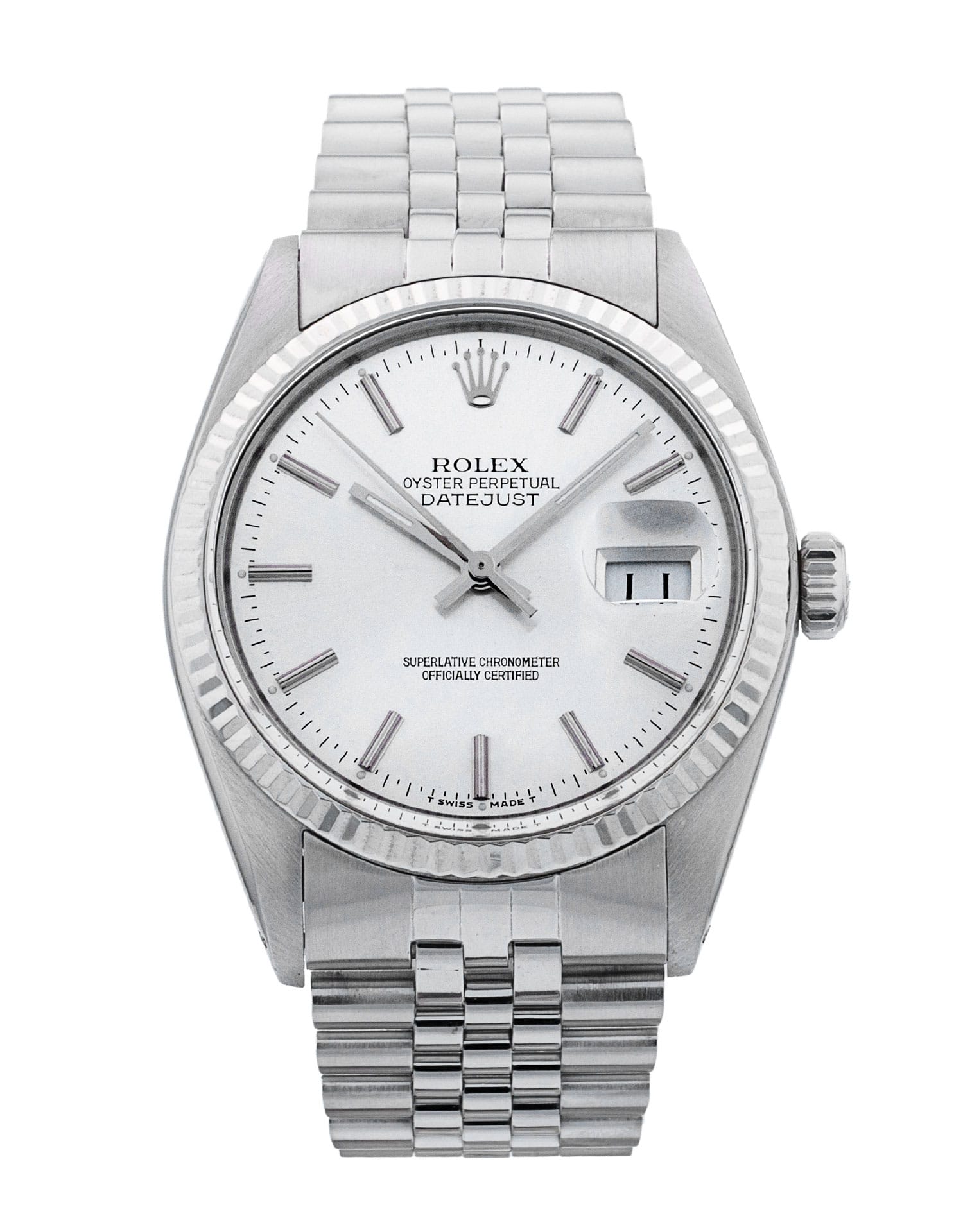 This Rolex Datejust 16014 has a silver baton dial and a bracelet strap. This Rolex has undergone a thorough inspection of water resistance, accuracy, functionality and condition to determine the level of reconditioning required to meet our strict standards. It has also been referenced against technical documents and manufacturer records where available to ensure authenticity and a clean history. All our watches have a 24-month warranty for your peace of mind. One of our skilled polishing technicians has removed marks on the case and bracelet of this watch, brought about by daily wear and tear, which is why this watch does not come with the remaining manufacturer’s warranty.