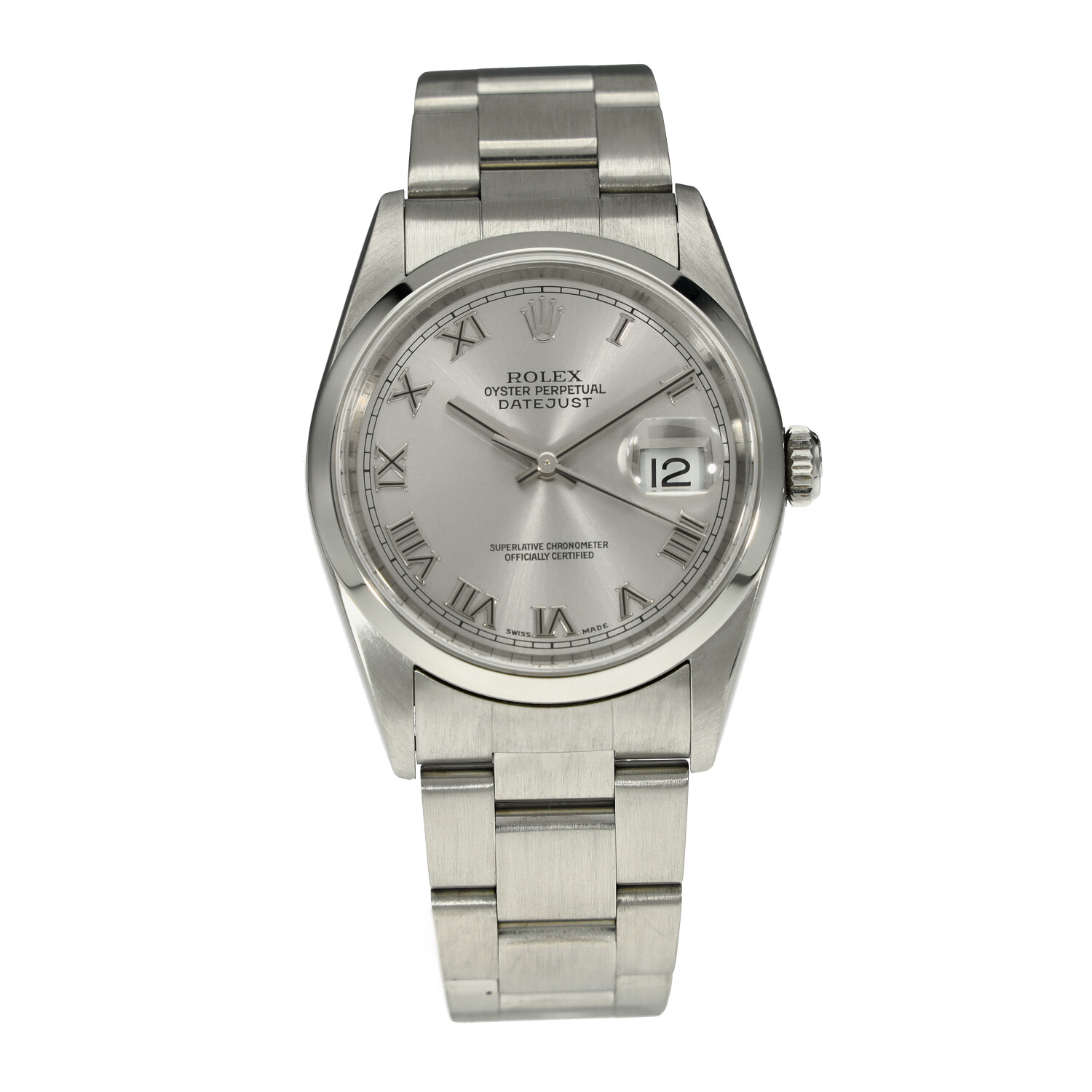 This Rolex Datejust 16200 has a silver roman numeral dial and a bracelet strap. This Rolex has undergone a thorough inspection of water resistance, accuracy, functionality and condition to determine the level of reconditioning required to meet our strict standards. It has also been referenced against technical documents and manufacturer records where available to ensure authenticity and a clean history. All our watches have a 24-month warranty for your peace of mind. One of our skilled polishing technicians has removed marks on the case and bracelet of this watch, brought about by daily wear and tear, which is why this watch does not come with the remaining manufacturer’s warranty.