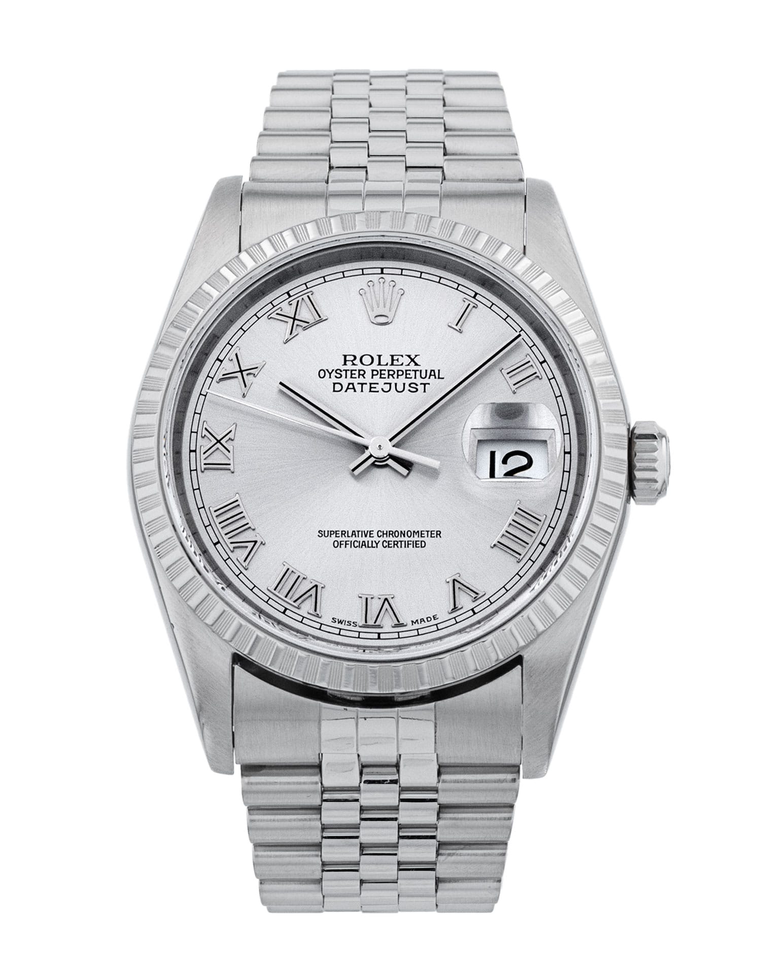 This Rolex Datejust 16220 has a silver roman numeral dial and a bracelet strap. This Rolex has undergone a thorough inspection of water resistance, accuracy, functionality and condition to determine the level of reconditioning required to meet our strict standards. It has also been referenced against technical documents and manufacturer records where available to ensure authenticity and a clean history. All our watches have a 24-month warranty for your peace of mind. One of our skilled polishing technicians has removed marks on the case and bracelet of this watch, brought about by daily wear and tear, which is why this watch does not come with the remaining manufacturer’s warranty.