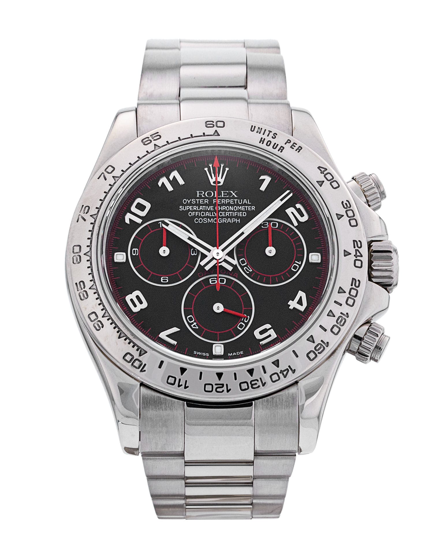 This Rolex Daytona 116509 has a black arabic dial and a bracelet strap. This Rolex has undergone a thorough inspection of water resistance, accuracy, functionality and condition to determine the level of reconditioning required to meet our strict standards. It has also been referenced against technical documents and manufacturer records where available to ensure authenticity and a clean history. All our watches have a 24-month warranty for your peace of mind. One of our skilled polishing technicians has removed marks on the case and bracelet of this watch, brought about by daily wear and tear, which is why this watch does not come with the remaining manufacturer’s warranty.