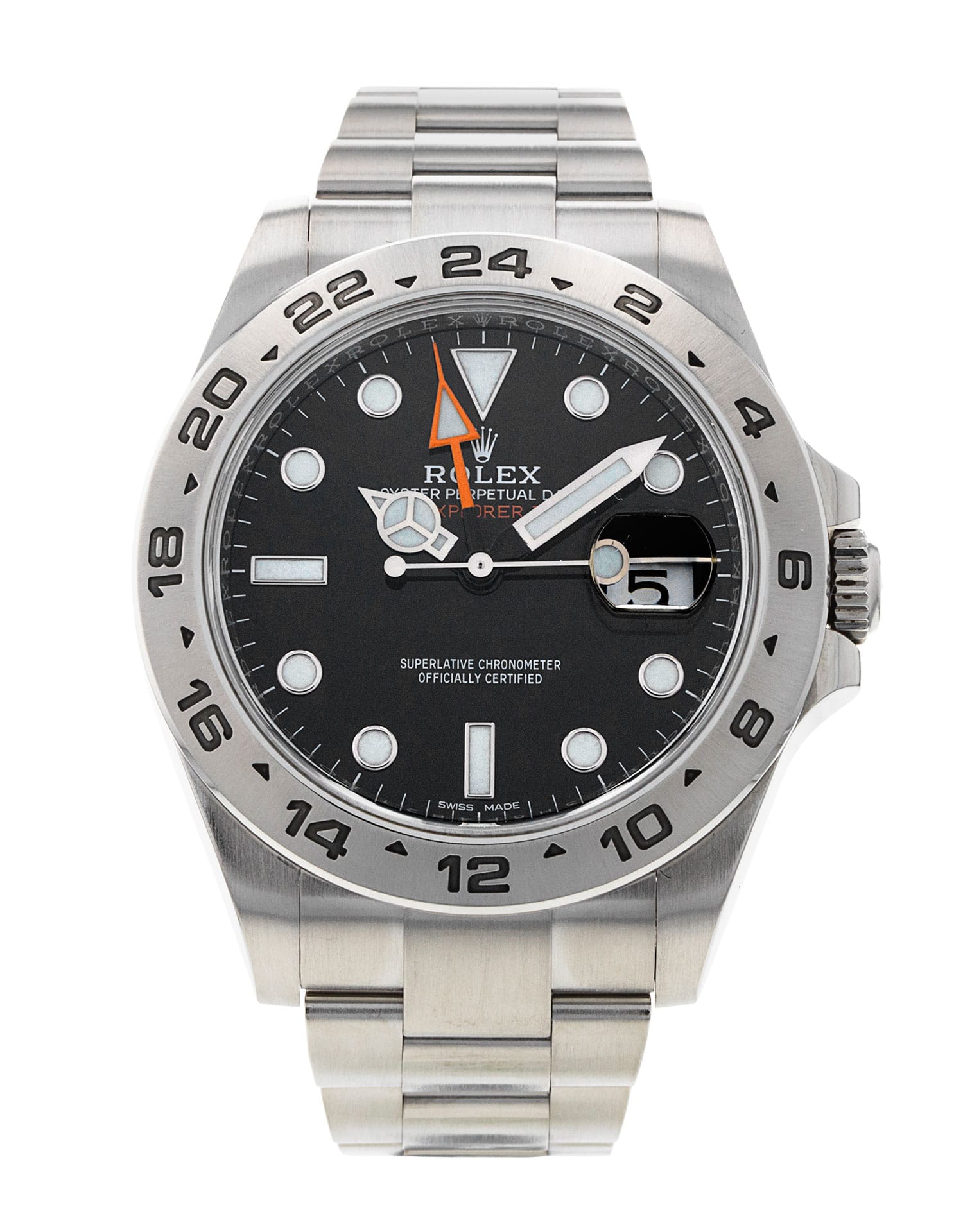 This Rolex Explorer II 216570 has a black dial and a bracelet strap. This Rolex has undergone a thorough inspection of water resistance, accuracy, functionality and condition to determine the level of reconditioning required to meet our strict standards. It has also been referenced against technical documents and manufacturer records where available to ensure authenticity and a clean history. All our watches have a 24-month warranty for your peace of mind. One of our skilled polishing technicians has removed marks on the case and bracelet of this watch, brought about by daily wear and tear, which is why this watch does not come with the remaining manufacturer’s warranty.