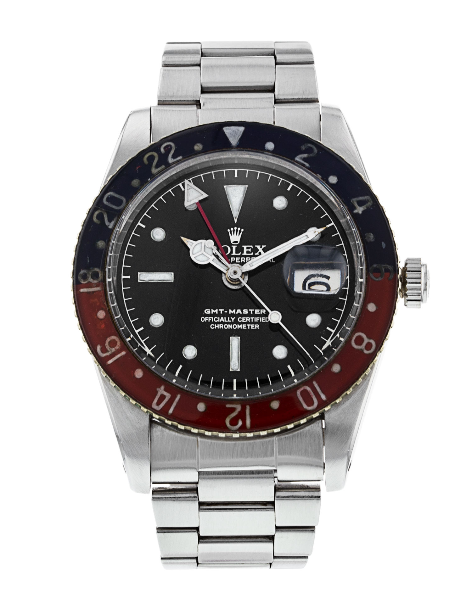 This Rolex GMT Master 6542 has a black baton dial and a bracelet strap. Due to age, this Rolex may not fall within our typical expected tolerances for timekeeping, and is no longer suitable for use in wet environments or submersion in water. In the interests of preserving original features, utmost care has been taken to sympathetically restore this watch. It has also been referenced against technical documents and manufacturer records where available to ensure authenticity and a clean history. One of our skilled polishing technicians has removed marks on the case and bracelet of this watch, brought about by daily wear and tear, which is why this watch does not come with the remaining manufacturer’s warranty.