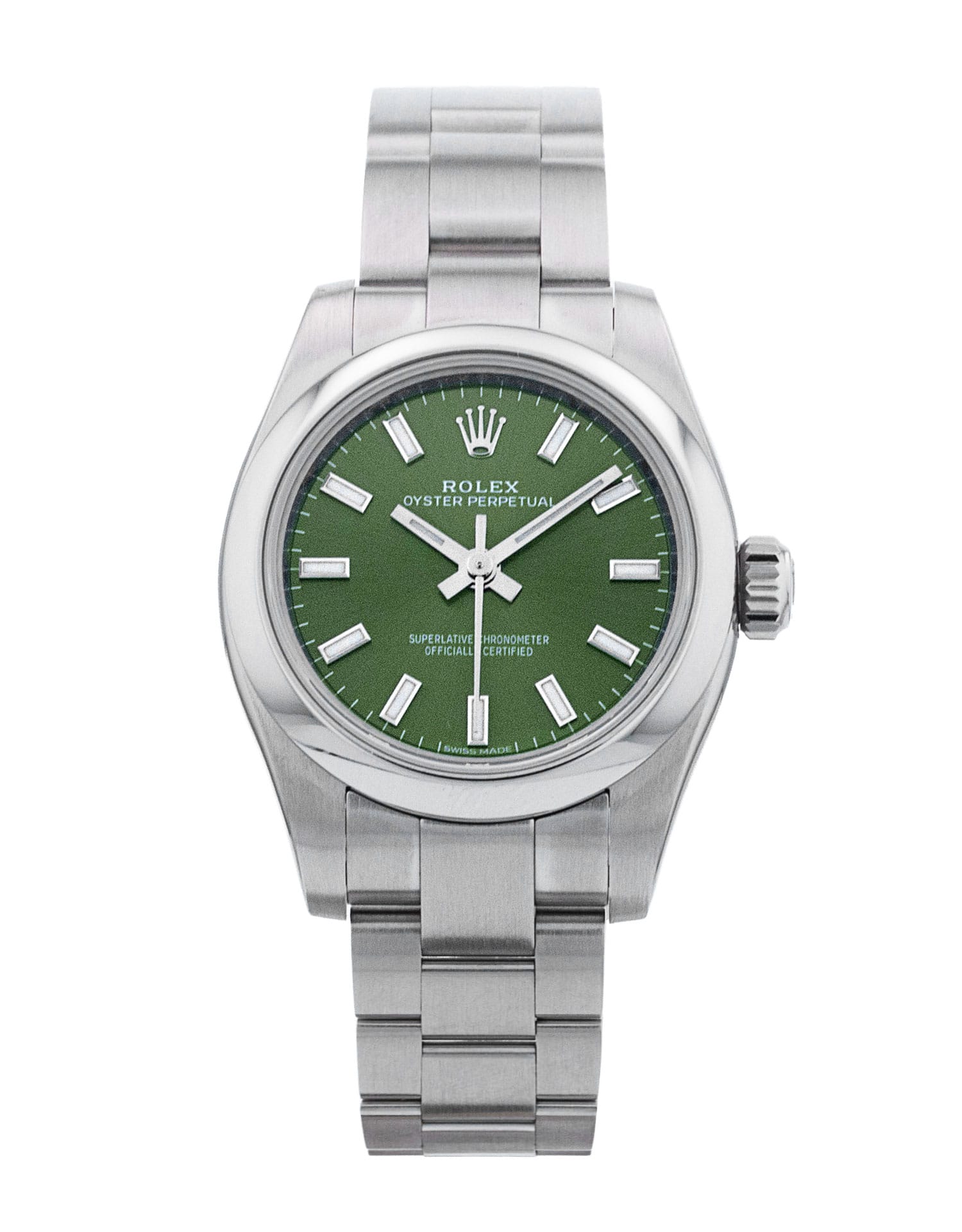 This Rolex Lady Oyster Perpetual 176200 has a green baton dial and a bracelet strap. This Rolex has undergone a thorough inspection of water resistance, accuracy, functionality and condition to determine the level of reconditioning required to meet our strict standards. It has also been referenced against technical documents and manufacturer records where available to ensure authenticity and a clean history. All our watches have a 24-month warranty for your peace of mind. One of our skilled polishing technicians has removed marks on the case and bracelet of this watch, brought about by daily wear and tear, which is why this watch does not come with the remaining manufacturer’s warranty.