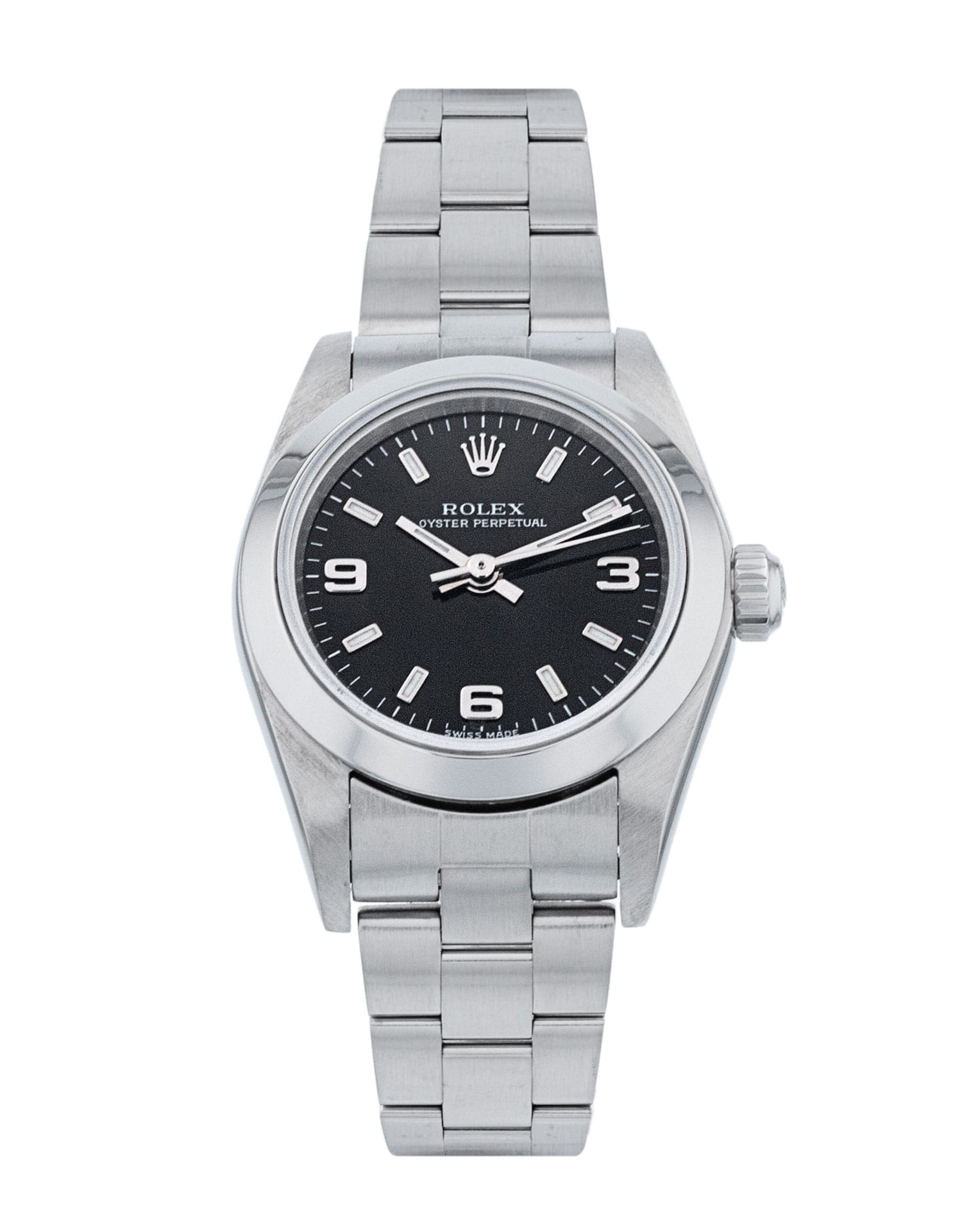 This Rolex Lady Oyster Perpetual 76080 has a black quarter arabic dial and a bracelet strap. This Rolex has undergone a thorough inspection of water resistance, accuracy, functionality and condition to determine the level of reconditioning required to meet our strict standards. It has also been referenced against technical documents and manufacturer records where available to ensure authenticity and a clean history. All our watches have a 24-month warranty for your peace of mind. One of our skilled polishing technicians has removed marks on the case and bracelet of this watch, brought about by daily wear and tear, which is why this watch does not come with the remaining manufacturer’s warranty.