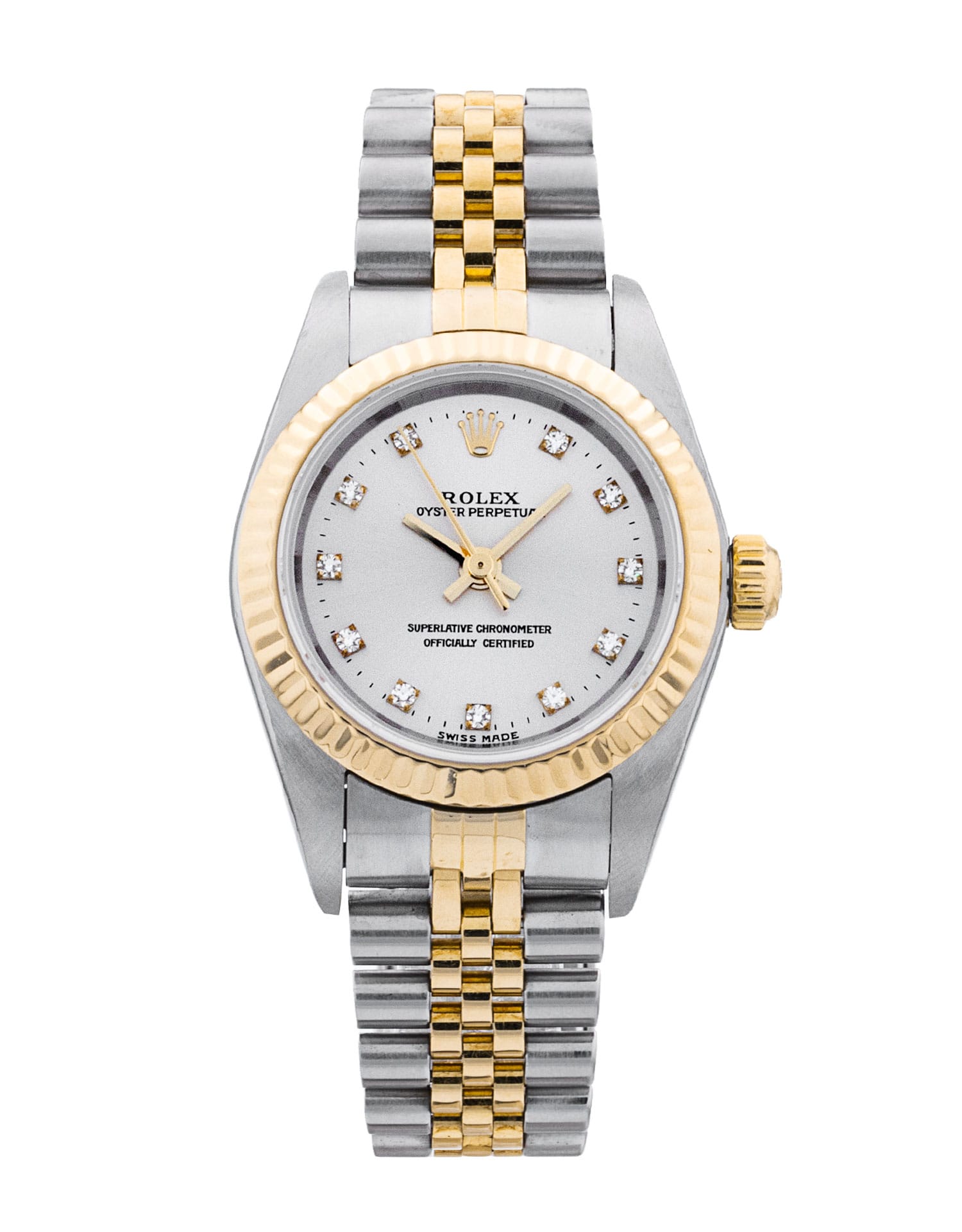 This Rolex Lady Oyster Perpetual 76193 has a silver diamond dial and a bracelet strap. This Rolex has undergone a thorough inspection of water resistance, accuracy, functionality and condition to determine the level of reconditioning required to meet our strict standards. It has also been referenced against technical documents and manufacturer records where available to ensure authenticity and a clean history. All our watches have a 24-month warranty for your peace of mind. One of our skilled polishing technicians has removed marks on the case and bracelet of this watch, brought about by daily wear and tear, which is why this watch does not come with the remaining manufacturer’s warranty.