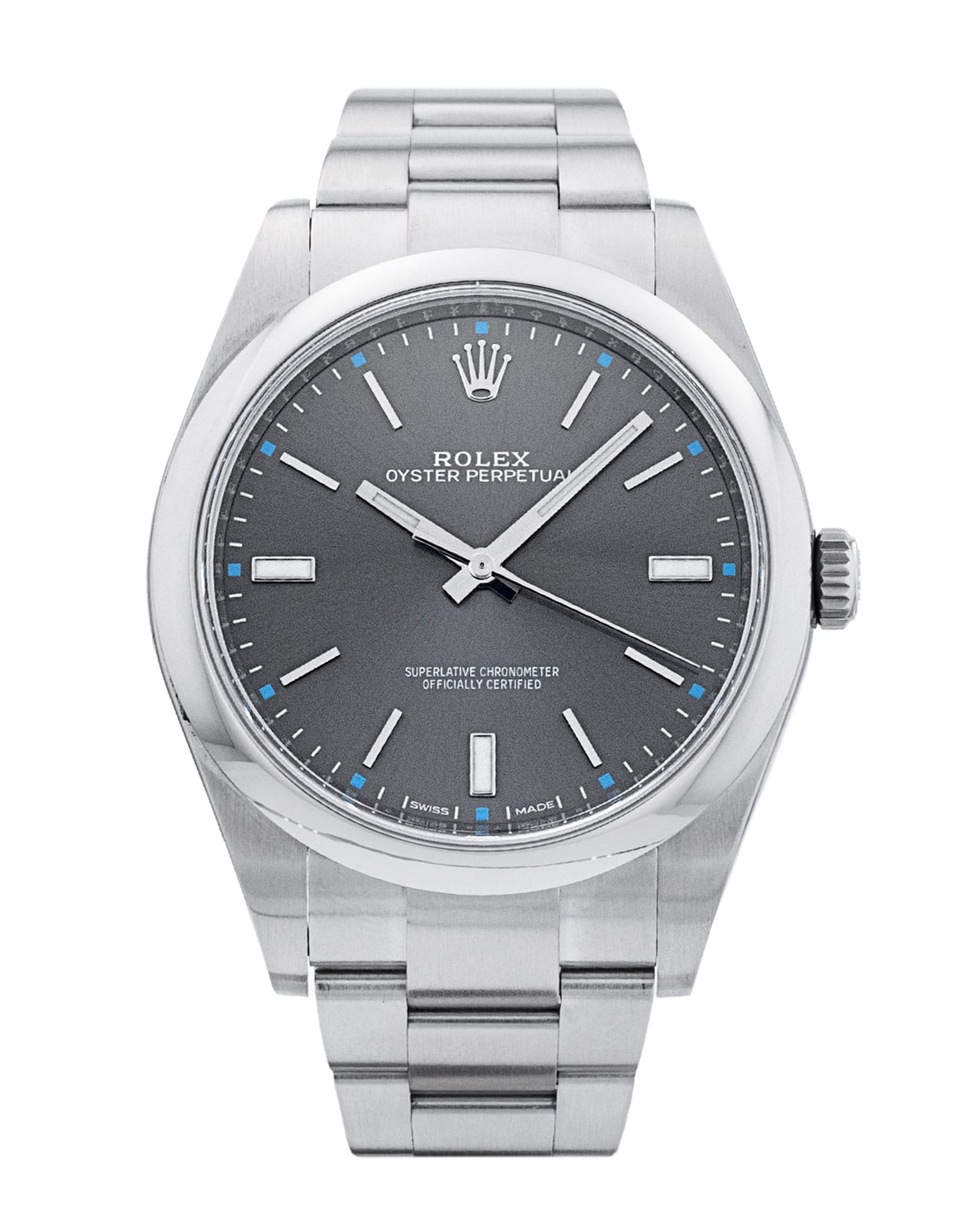 This Rolex Oyster Perpetual 114300 has a rhodium baton dial and a bracelet strap. This Rolex has undergone a thorough inspection of water resistance, accuracy, functionality and condition to determine the level of reconditioning required to meet our strict standards. It has also been referenced against technical documents and manufacturer records where available to ensure authenticity and a clean history. All our watches have a 24-month warranty for your peace of mind. One of our skilled polishing technicians has removed marks on the case and bracelet of this watch, brought about by daily wear and tear, which is why this watch does not come with the remaining manufacturer’s warranty.