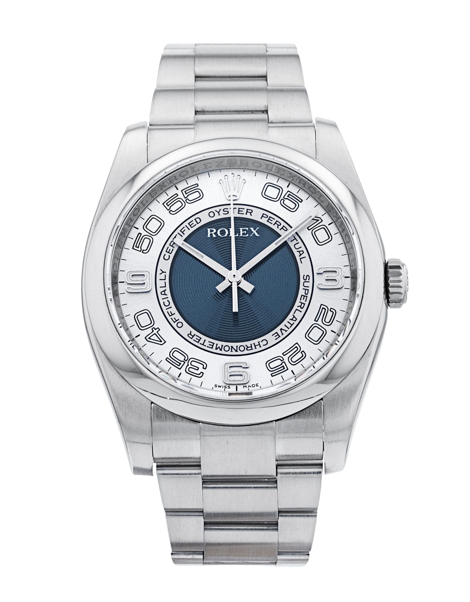 This Rolex Oyster Perpetual 116000 has a blue & silver dial and a bracelet strap. This Rolex has undergone a thorough inspection of water resistance, accuracy, functionality and condition to determine the level of reconditioning required to meet our strict standards. It has also been referenced against technical documents and manufacturer records where available to ensure authenticity and a clean history. All our watches have a 24-month warranty for your peace of mind. One of our skilled polishing technicians has removed marks on the case and bracelet of this watch, brought about by daily wear and tear, which is why this watch does not come with the remaining manufacturer’s warranty.