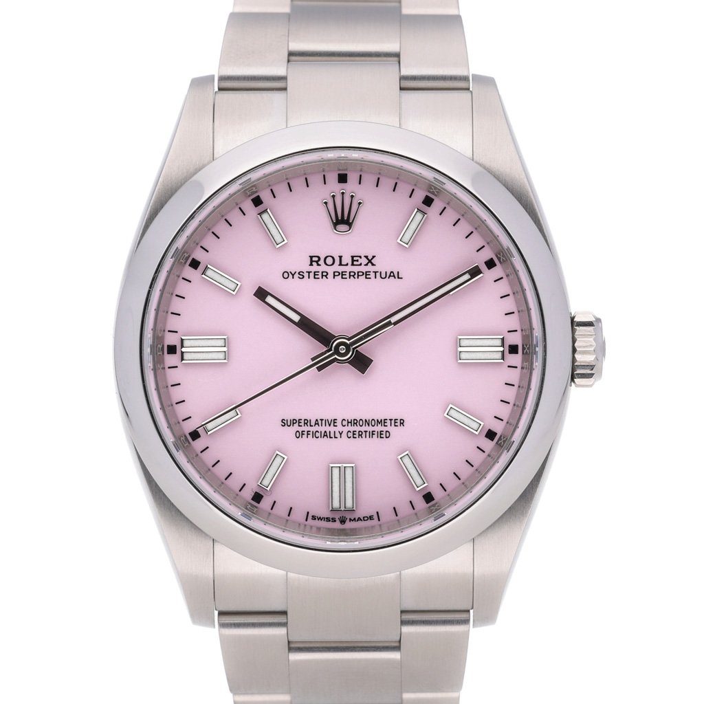 This Rolex Oyster Perpetual 126000 has a candy pink dial and a bracelet strap. This Rolex has undergone a thorough inspection of water resistance, accuracy, functionality and condition to determine the level of reconditioning required to meet our strict standards. It has also been referenced against technical documents and manufacturer records where available to ensure authenticity and a clean history. Our watches have a 24-month warranty for your peace of mind, in conjunction with any remaining manufacturer’s warranty from new or from service. To maintain the manufacturer’s warranty on this watch, it has not been polished in our service centre.
