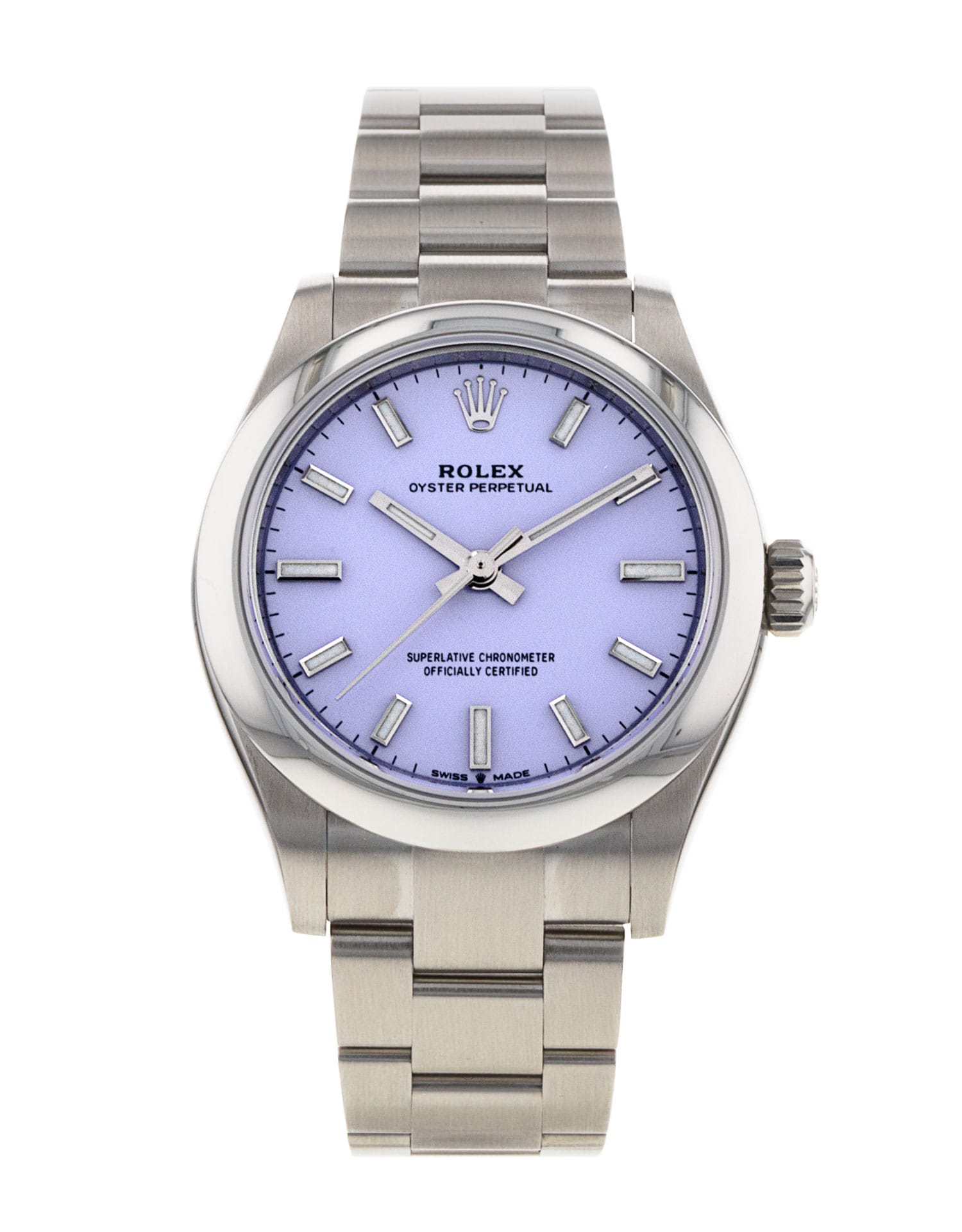 This Rolex Oyster Perpetual 277200 has a lavender dial and a bracelet strap. This Rolex has undergone a thorough inspection of water resistance, accuracy, functionality and condition to determine the level of reconditioning required to meet our strict standards. It has also been referenced against technical documents and manufacturer records where available to ensure authenticity and a clean history. Our watches have a 24-month warranty for your peace of mind, in conjunction with any remaining manufacturer’s warranty from new or from service. To maintain the manufacturer’s warranty on this watch, it has not been polished in our service centre.