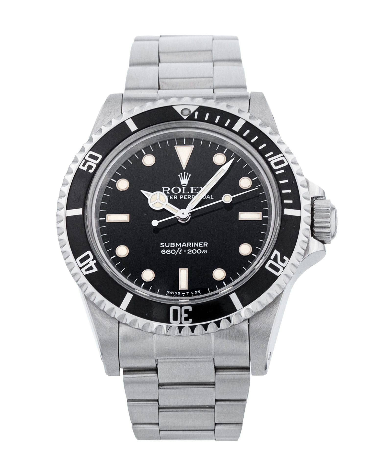 This Rolex Submariner 5513 has a black dial and a bracelet strap. This Rolex has undergone a thorough inspection of water resistance, accuracy, functionality and condition to determine the level of reconditioning required to meet our strict standards. It has also been referenced against technical documents and manufacturer records where available to ensure authenticity and a clean history. All our watches have a 24-month warranty for your peace of mind. One of our skilled polishing technicians has removed marks on the case and bracelet of this watch, brought about by daily wear and tear, which is why this watch does not come with the remaining manufacturer’s warranty.