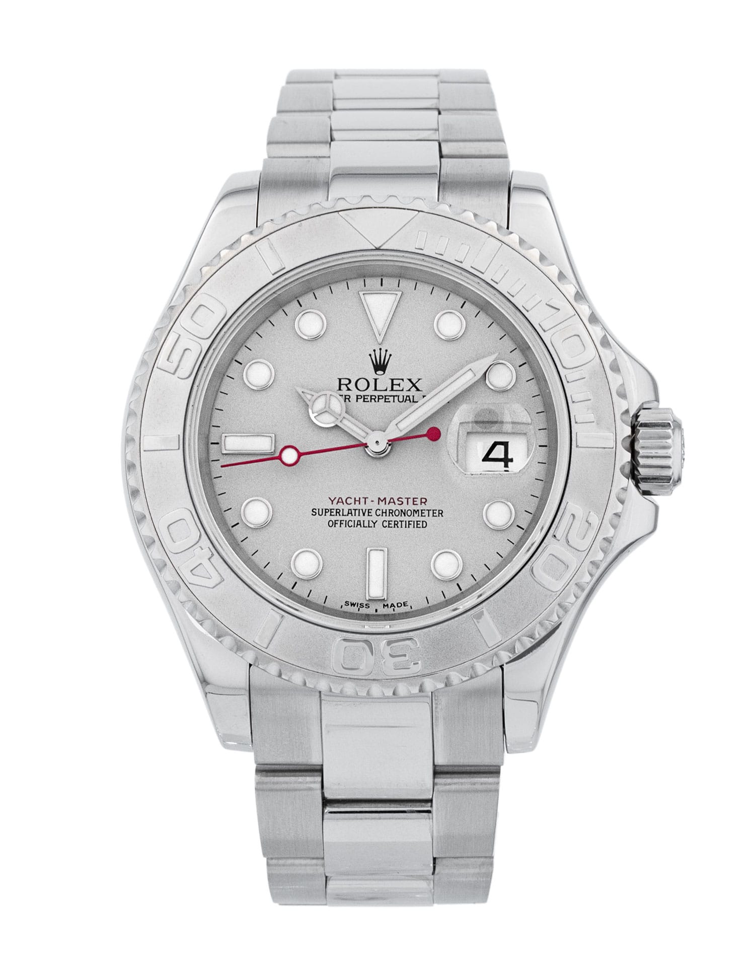 This Rolex Yacht-Master 16622 has a platinum dial and a bracelet strap. This Rolex has undergone a thorough inspection of water resistance, accuracy, functionality and condition to determine the level of reconditioning required to meet our strict standards. It has also been referenced against technical documents and manufacturer records where available to ensure authenticity and a clean history. All our watches have a 24-month warranty for your peace of mind. One of our skilled polishing technicians has removed marks on the case and bracelet of this watch, brought about by daily wear and tear, which is why this watch does not come with the remaining manufacturer’s warranty.