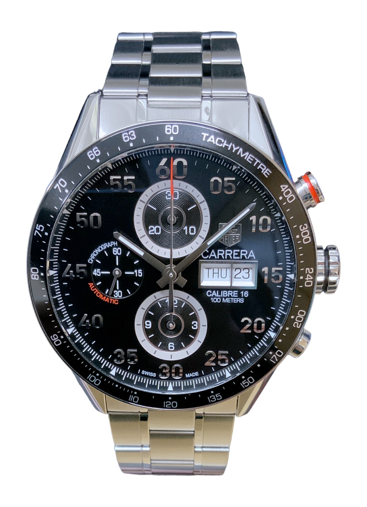 This Tag Heuer Carrera CV2A10.BA0796 has a black dial, black sub dials dial and a bracelet strap. This Tag Heuer has undergone a thorough inspection of accuracy, functionality and condition at our Tag Heuer certified service centre to determine the level of reconditioning required to meet our strict standards. It has also been checked against our records to ensure authenticity. Our watches have a 24-month warranty for your peace of mind, in conjunction with any remaining manufacturer’s warranty from new or from service.