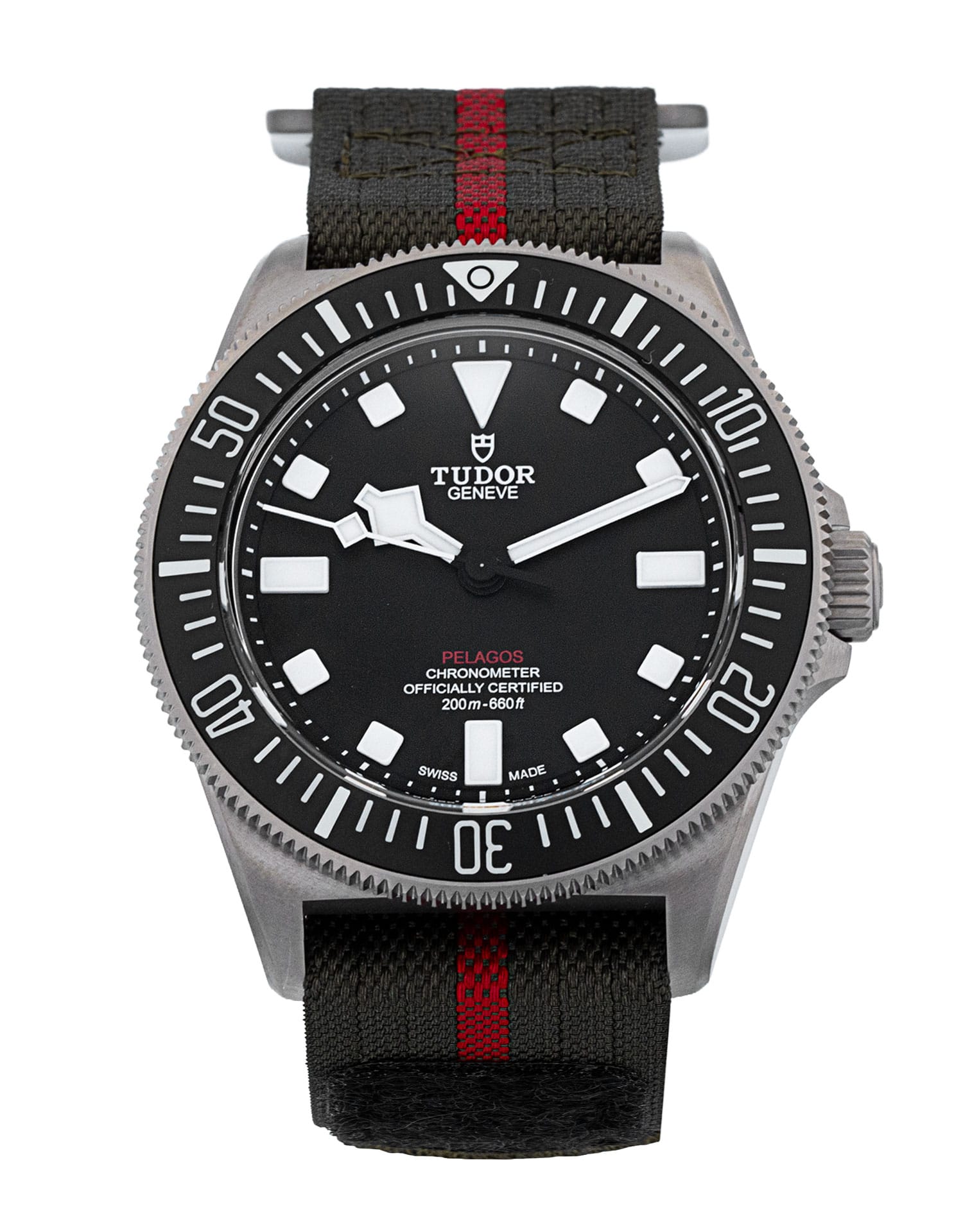 This Tudor Pelagos FXD M25717N-0001 has a black dial and a fabric strap. This Tudor has undergone a thorough inspection of water resistance, accuracy, functionality and condition to determine the level of reconditioning required to meet our strict standards. It has also been referenced against technical documents and manufacturer records where available to ensure authenticity and a clean history. Our watches have a 24-month warranty for your peace of mind, in conjunction with any remaining manufacturer’s warranty from new or from service. To maintain the manufacturer’s warranty on this watch, it has not been polished in our service centre.